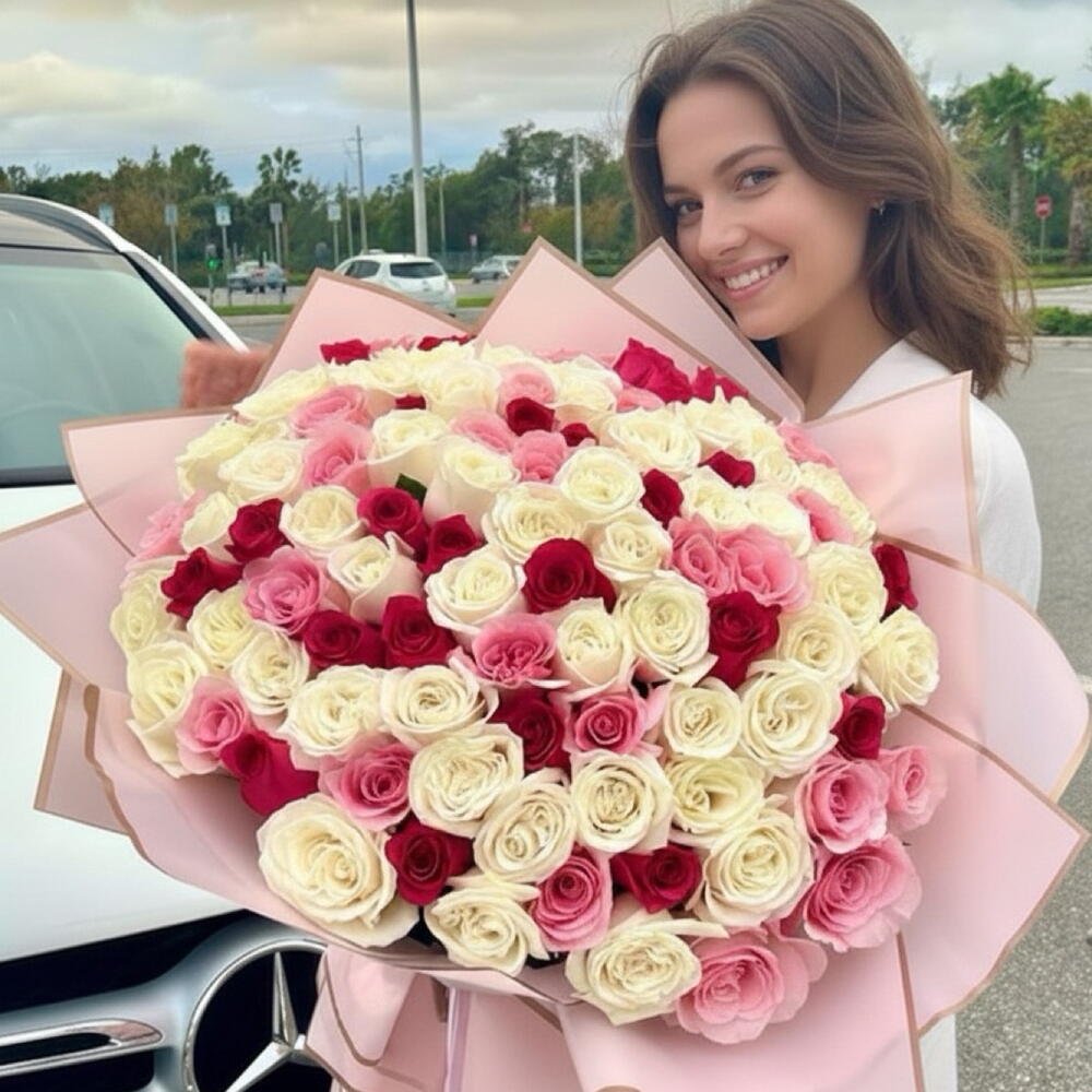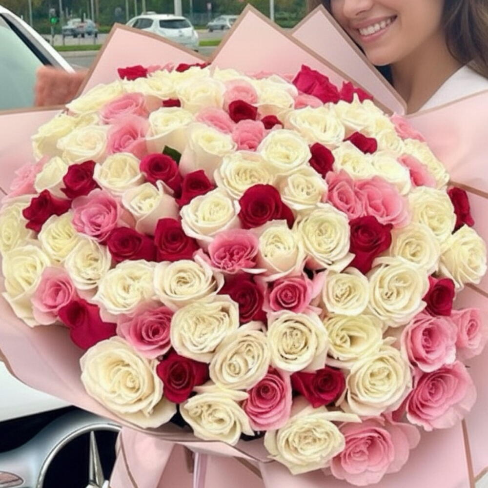 red roses - 31 шт. pink roses - 30 шт. white roses - 40 шт.