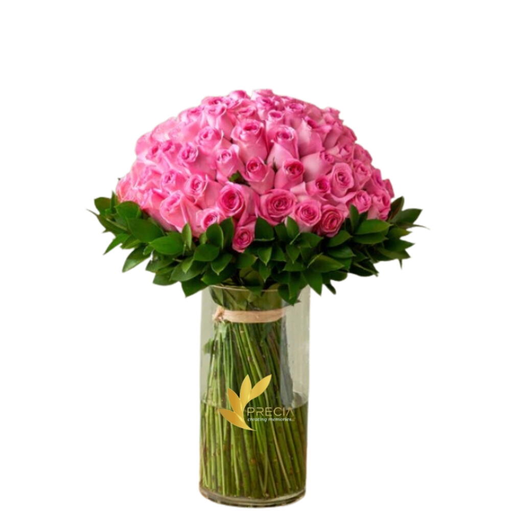 101 розовая роза в вазе