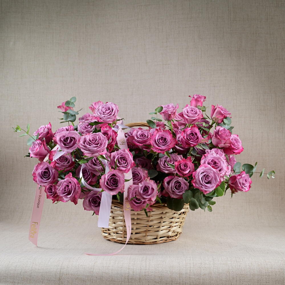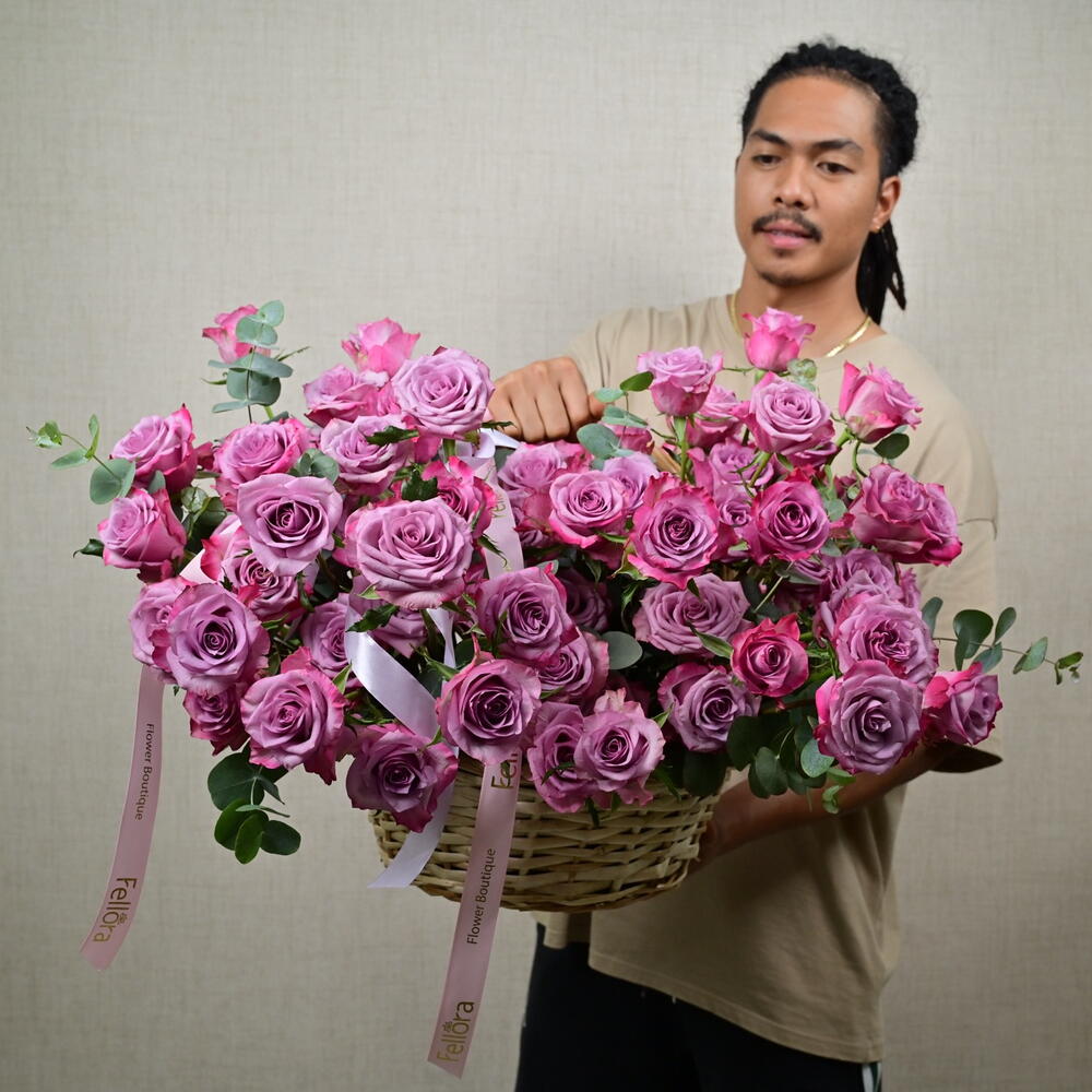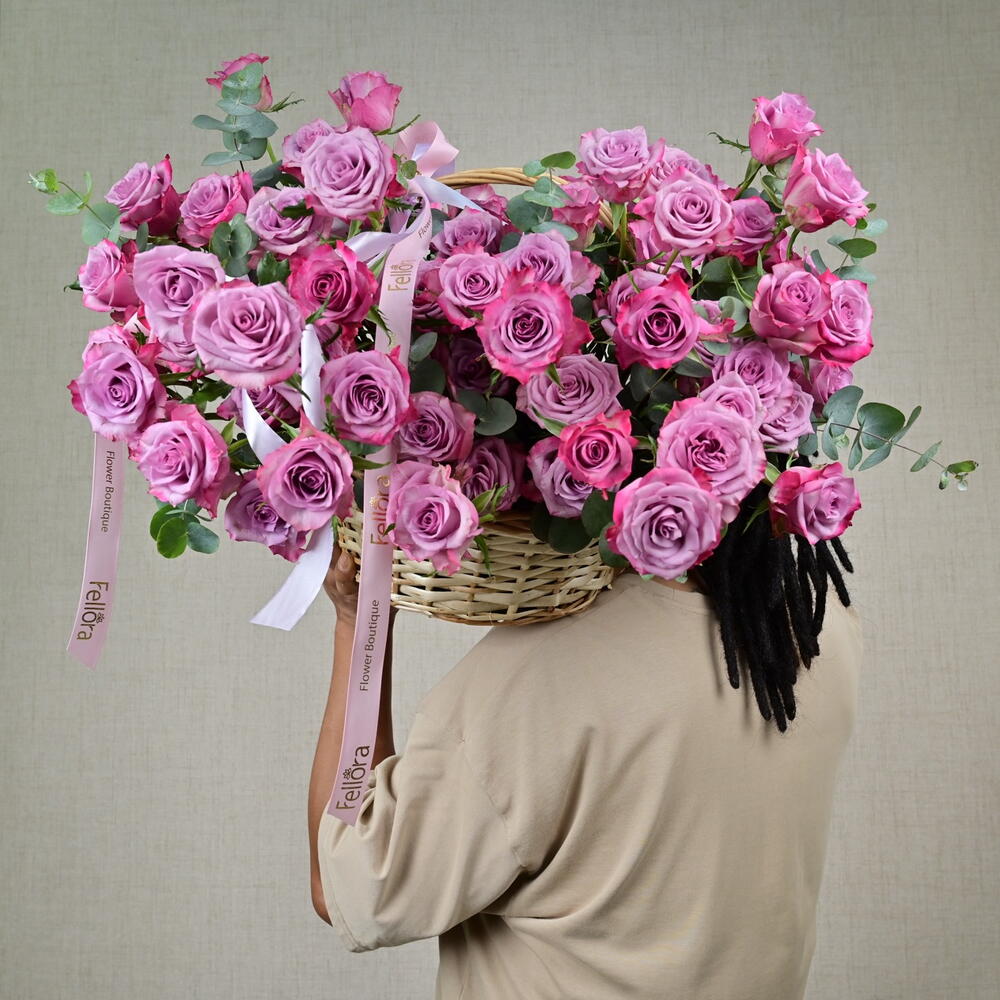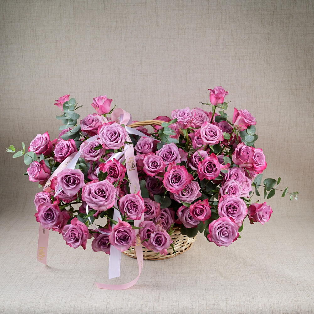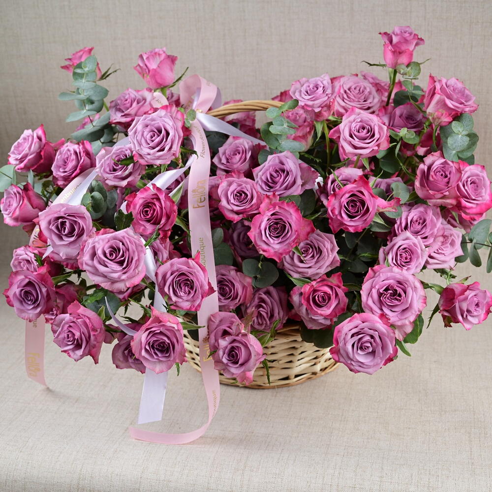 Цветочная корзина из 101 фиолетовой розы с листьями эвкалипта