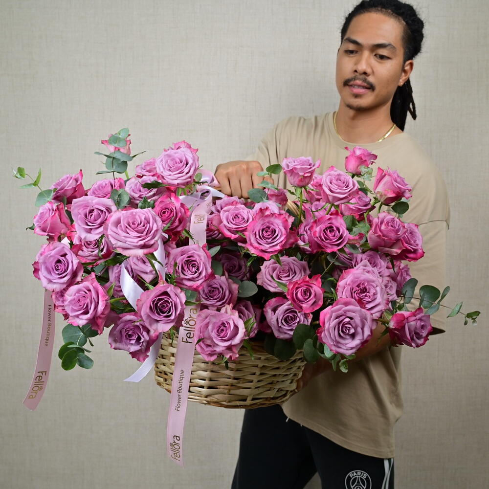 purple rose - 101 шт. ribbon satin - 1 шт. eucalyptus leaves - 10 шт. деревянная корзина - 1 шт.