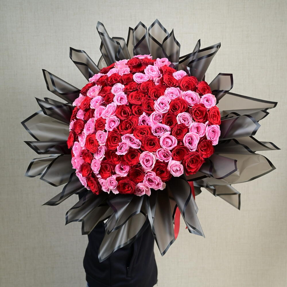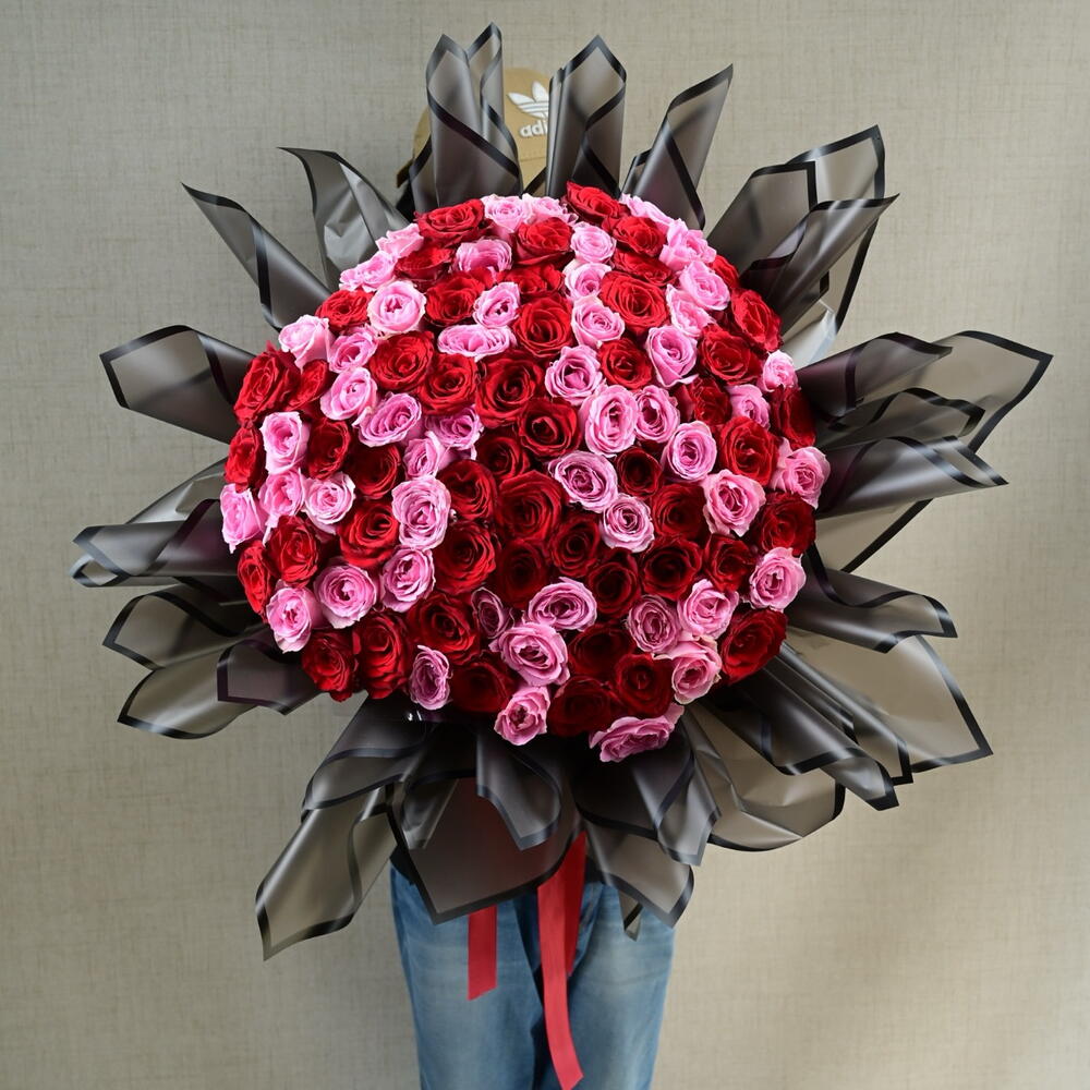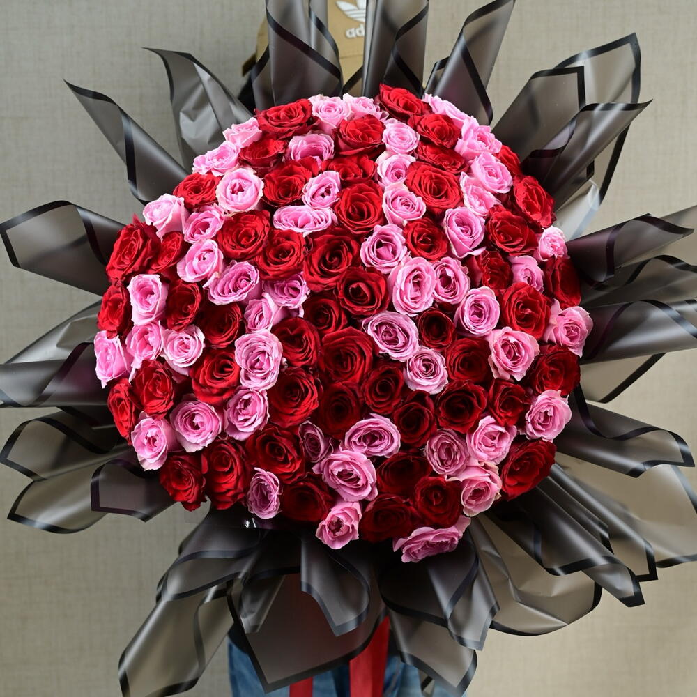 Букет из 101 розы розового и красного цвета с дизайнерской упаковкой
