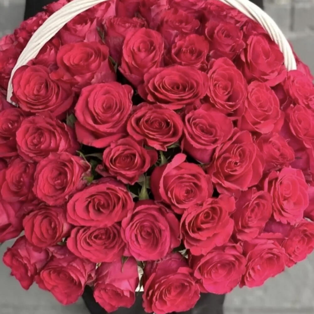 Корзина переполнена яркими, темно-красными розами, символизирующими любовь, страсть и преданность. Аранжировка: Розы плотно уложены, вокруг краев и внутри аранжировки видно немного зелени.
