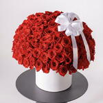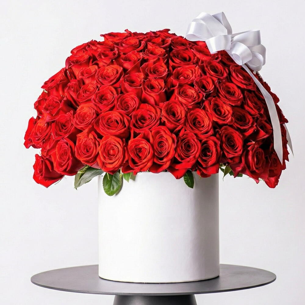 Сделайте смелое и одновременно элегантное заявление ко Дню святого Валентина с помощью этой роскошной композиции из 101 отборной красной розы, красиво оформленной в классической белой круглой шляпной коробке. Каждая роза отобрана вручную за свой насыщенный цвет, свежесть и пышность, символизируя глубокую любовь, страсть и преданность. Контраст ярких красных роз на фоне элегантной белой шляпной коробки создает изысканный, высококлассный образ — идеально подходящий для Дня святого Валентина, годовщин, предложений руки и сердца или грандиозных романтических сюрпризов. Завершенная профессиональным флористическим оформлением, эта композиция говорит сама за себя и оставляет неизгладимое впечатление. Идеально подходит для: Дня святого Валентина, романтических сюрпризов, роскошных подарков, предложений руки и сердца и незабываемых моментов.