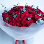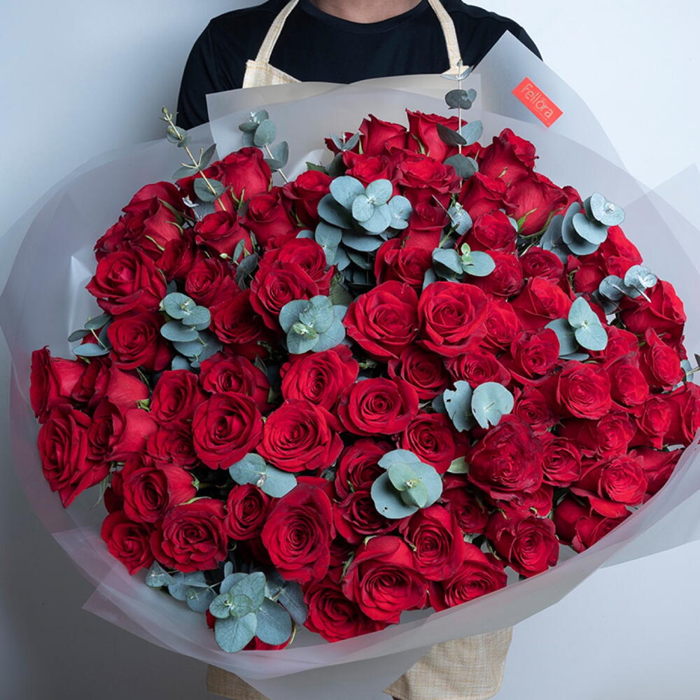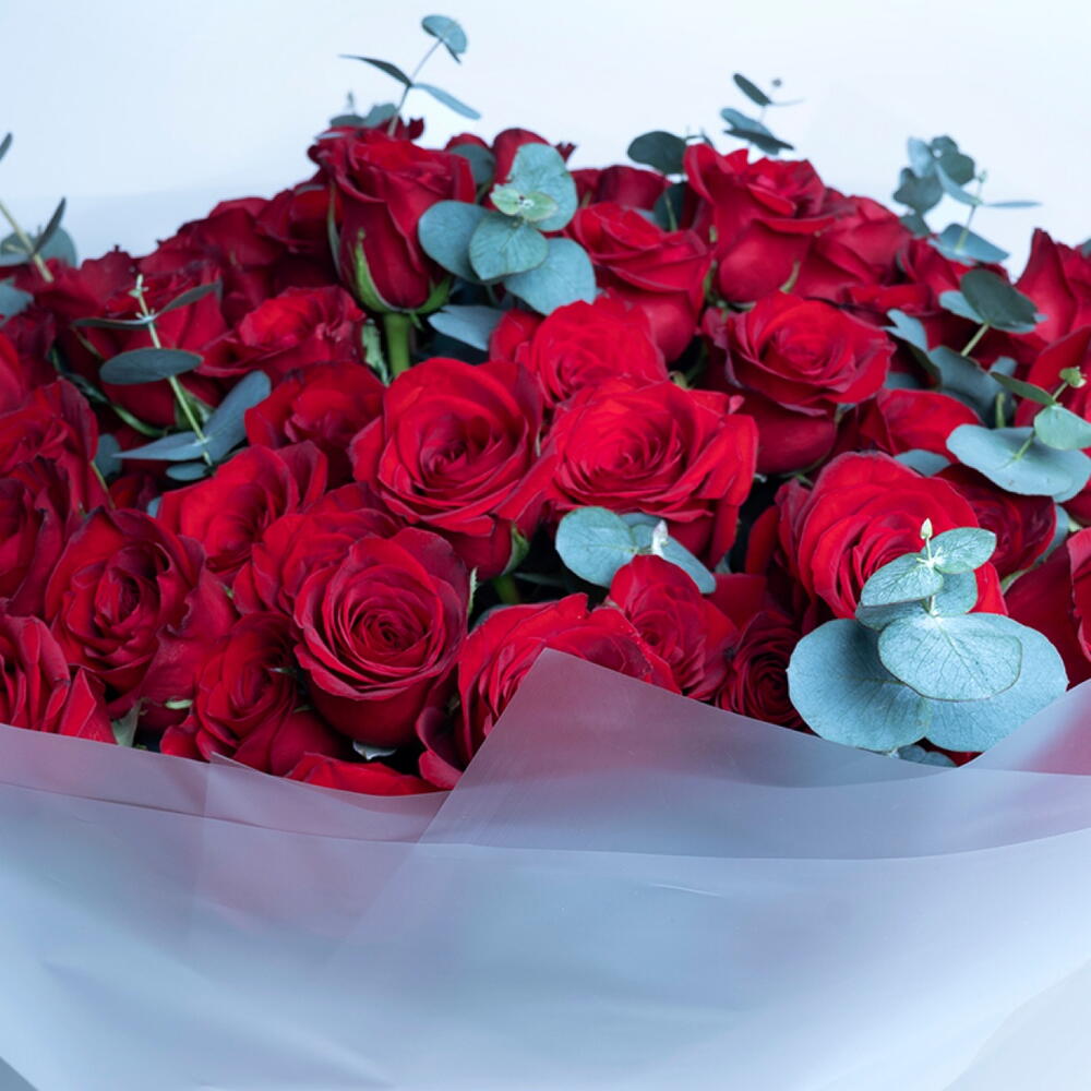 Букет из 101 красной розы с листьями эвкалипта
