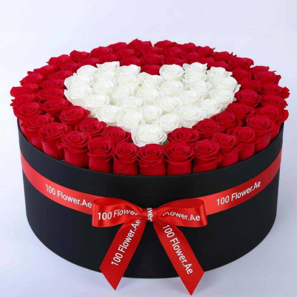 Коробка из 101 красной розы с белыми розами в форме сердца