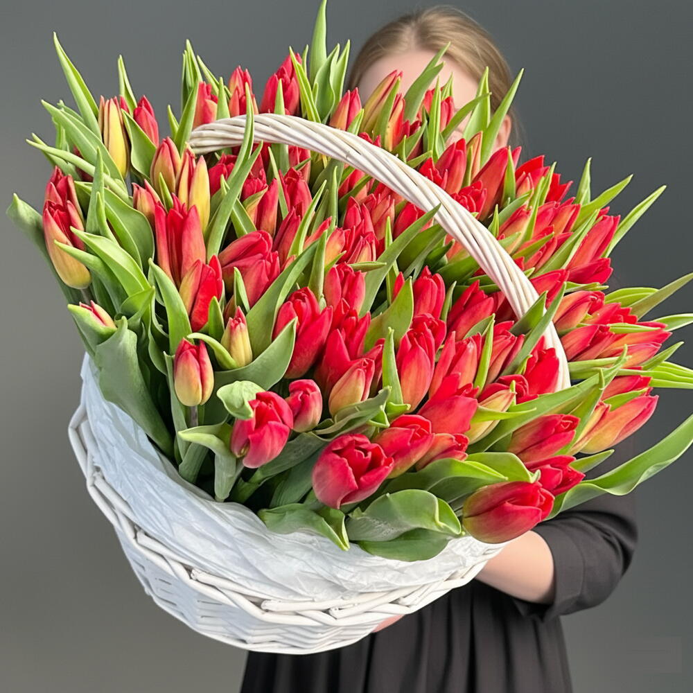 Корзина из 101 красных тюльпанов
