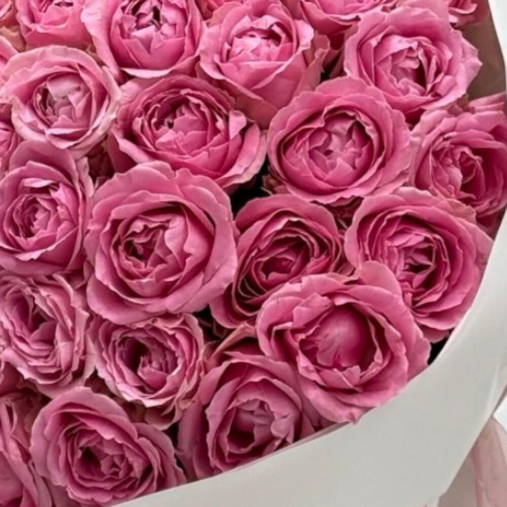Цветы: Букет состоит из многочисленных розовых роз, которые часто ассоциируются с признательностью, чистой любовью, женственностью и грацией. Упаковка: Композиция элегантно завернута в чёрную бумагу, которая обеспечивает поразительный контраст с мягкими розовыми оттенками роз. Лента: Светло-розовая лента завязана вокруг основания упаковки, чтобы закрепить букет.