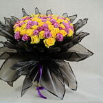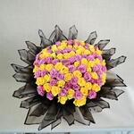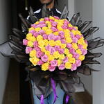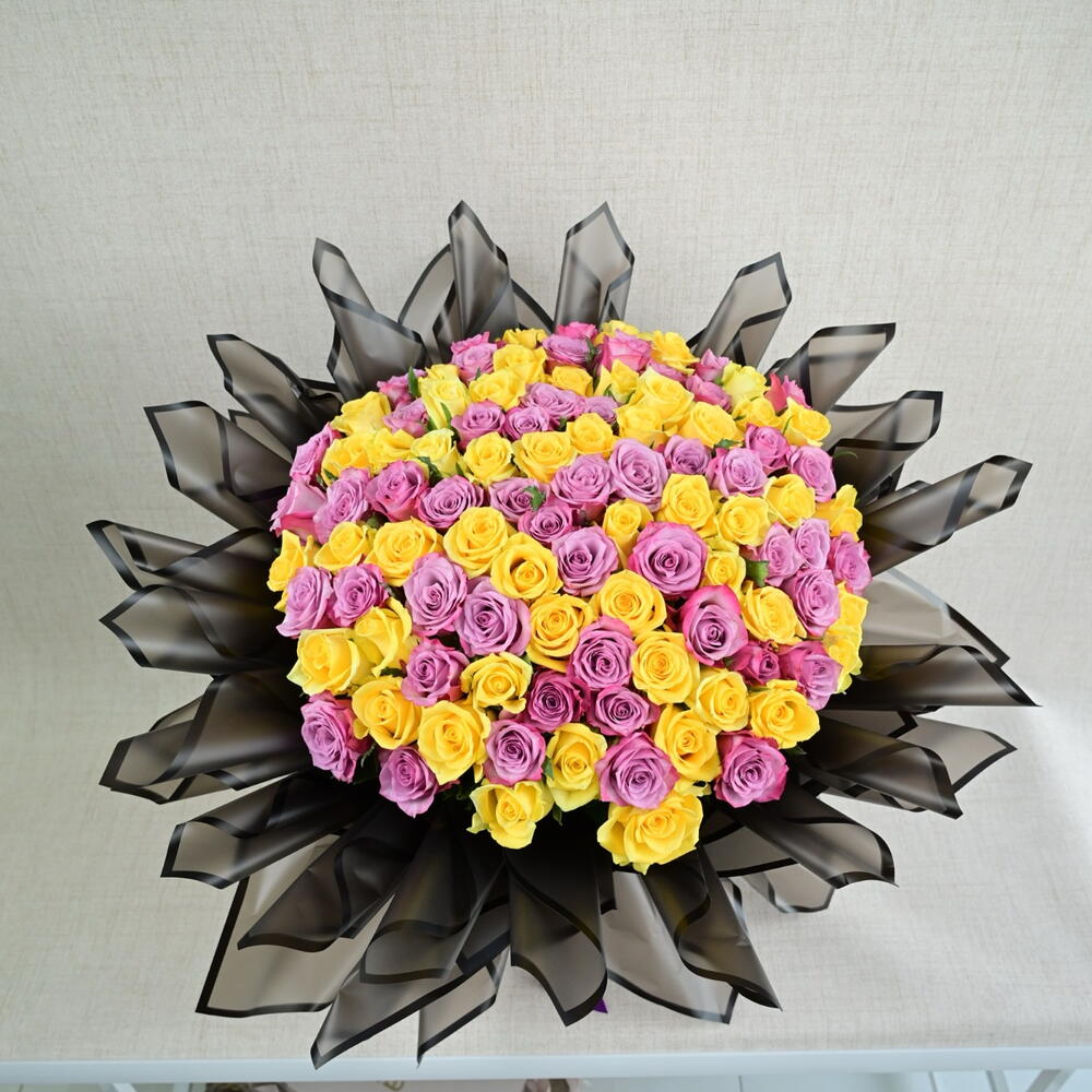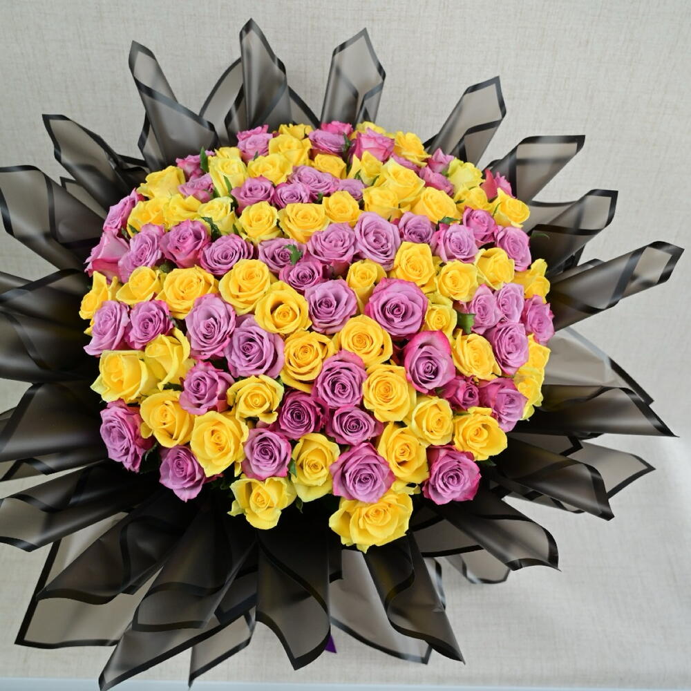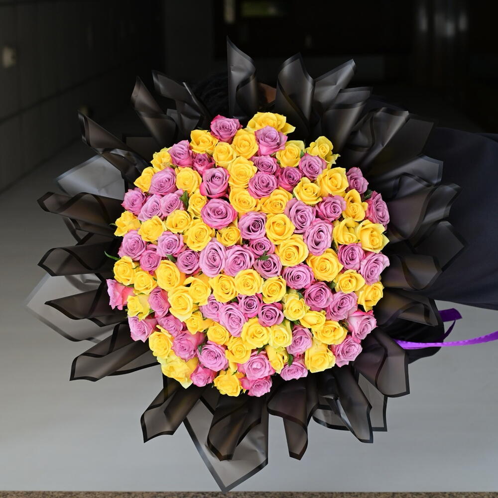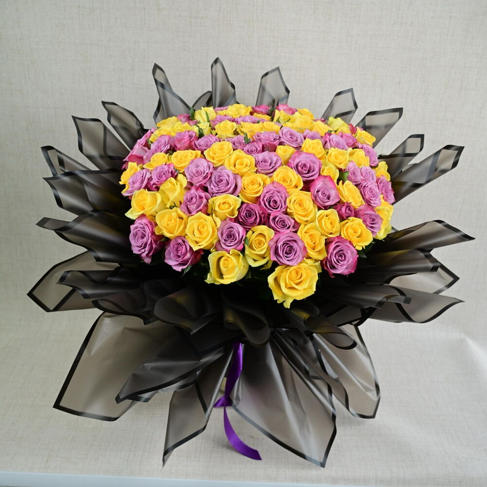 Yellow rose - 51 шт. purple rose - 50 шт. ribbon satin - 1 шт. украшение упаковки - 10 шт.