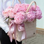 Composition: pink hydrangea - 11, bag - 1, Oasis - 1 Sizes: WIDTH - 50CM; HEIGHT - 50CM; LENGTH - 50CM; (including packaging) Размер: 50 x 50 x 50 см