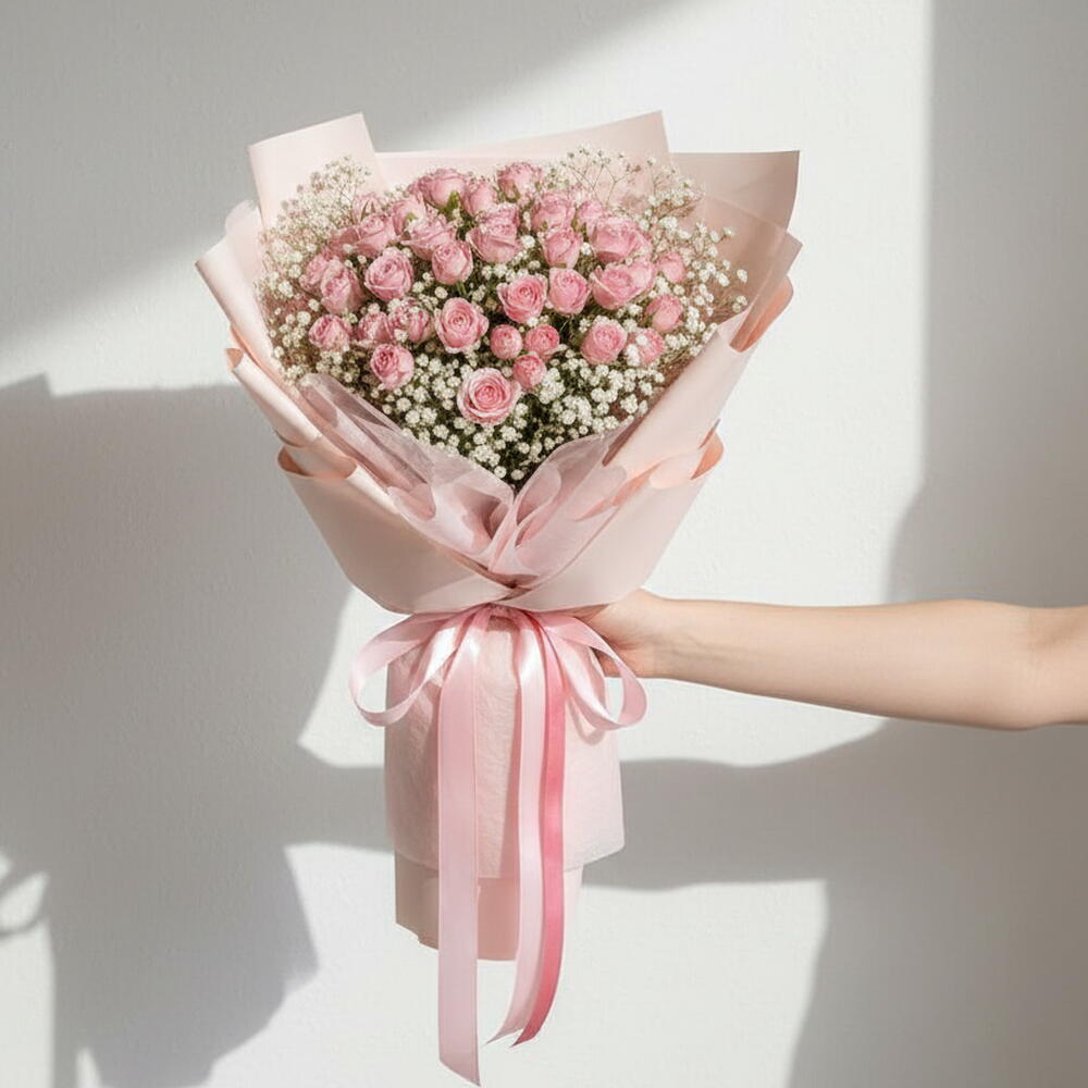 Очаровательный букет из 11 розовых кустовых роз с добавлением нежной гипсофилы, создающий мягкую и элегантную композицию. Идеально подходит для дней рождения, годовщин или особых случаев.