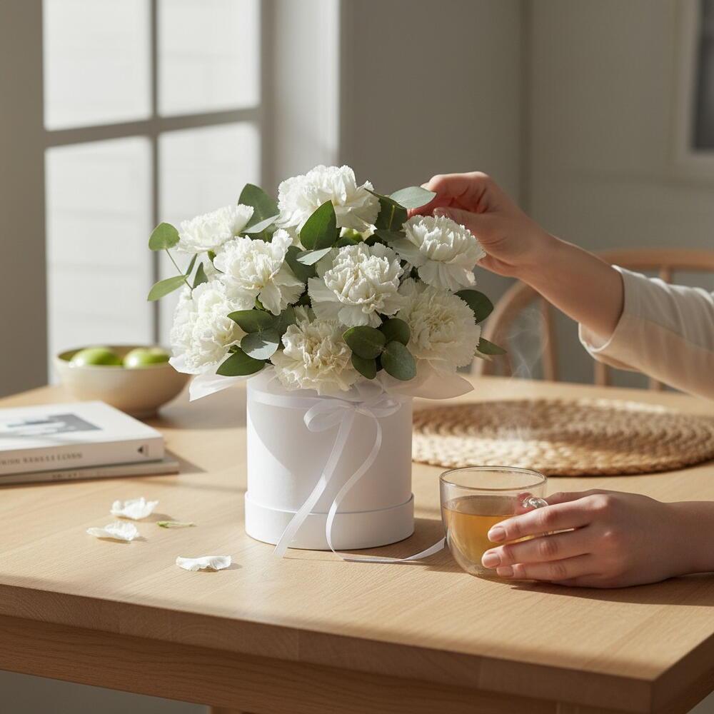 Eucalyptus - 2 шт. white ribbon - 1 шт. white box - 1 шт. белый гвоздика - 11 шт.