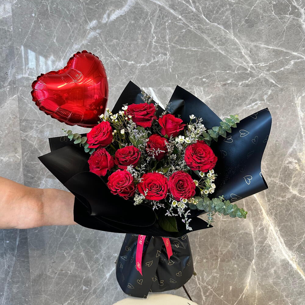 Wax flower - 2 шт. balloon - 1 шт. лимониум пурпурный - 2 шт. eycalyptus - 3 шт. red roses - 11 шт.