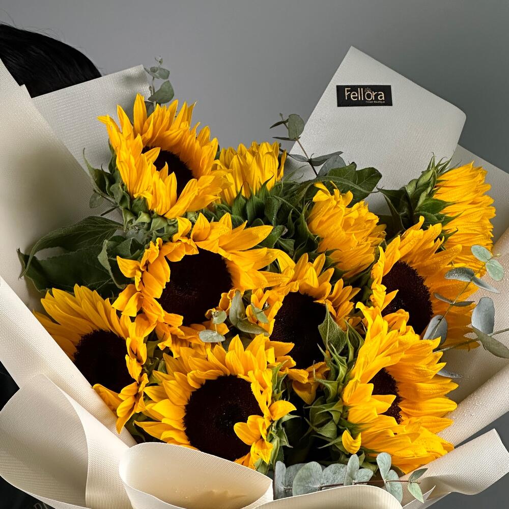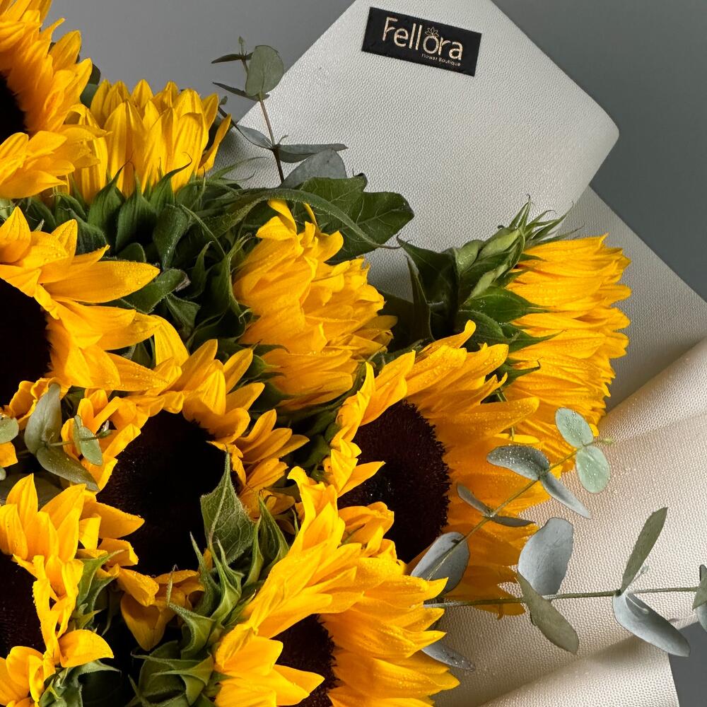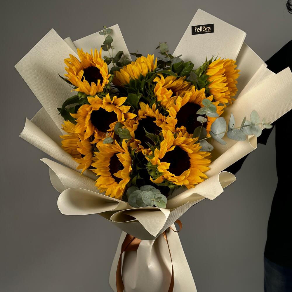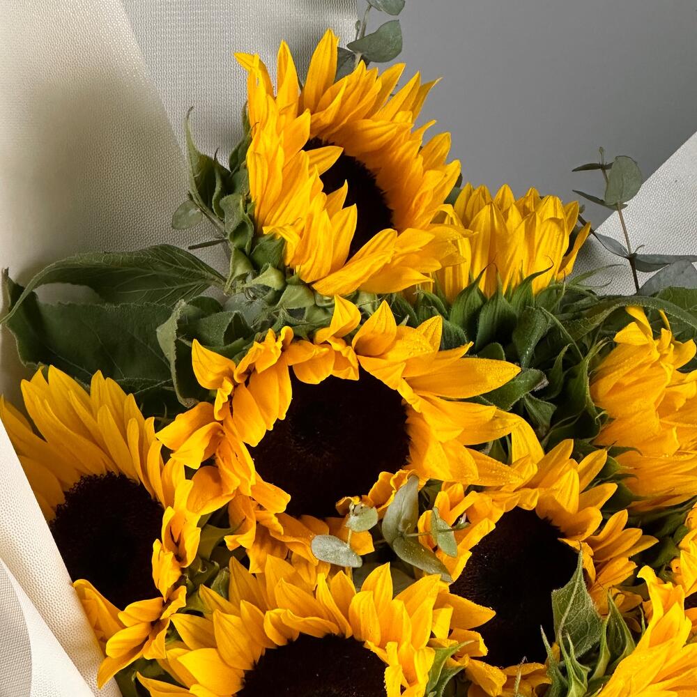 Букеты из 11 стеблей подсолнуха с листьями эвкалипта. Упакованы и перевязаны лентой.