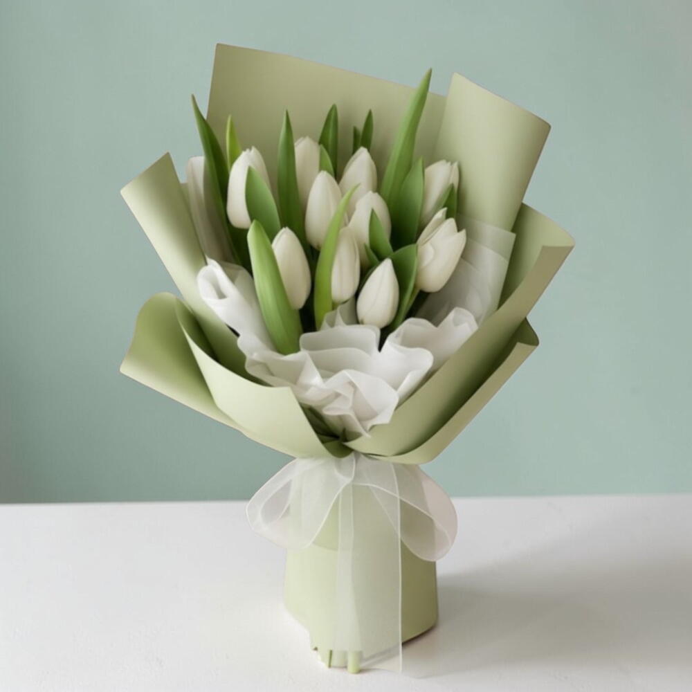 Букет из 11 белых тюльпанов с наполнителями в красивой упаковке. Элегантный букет из 11 белых тюльпанов с нежными наполнителями, красиво упакованный в премиальную бумагу для свежей и изящной подачи. Этот букет белых тюльпанов идеально подходит для свадеб, юбилеев и особых случаев. Свежие, собранные вручную тюльпаны приносят чистоту, элегантность и долговечную красоту. Совет по уходу: Обрежьте стебли под углом, поместите в чистую воду и держите вдали от прямых солнечных лучей. Меняйте воду каждые 2 дня, чтобы сохранить свежесть и продлить срок жизни в вазе.
