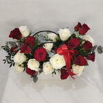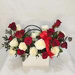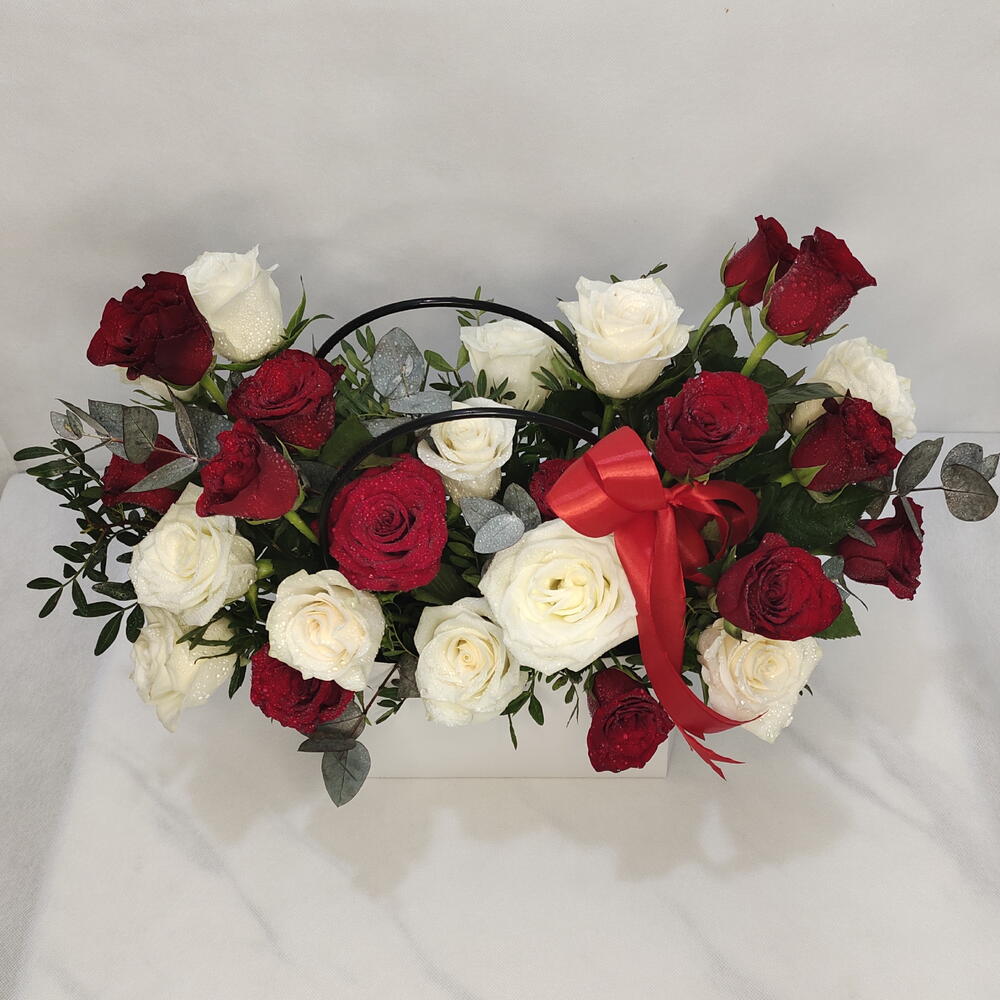 Dreamland : 12 стеблей красных роз 12 стеблей белых роз 12 стеблей красных роз 12 стеблей белых роз в красивой сумке. Привлекающая внимание композиция из 24 чисто-белых и ярко-красных роз, безупречно сформированных и обрамлённых зелёными листьями. Оформлена привлекательной красной лентой