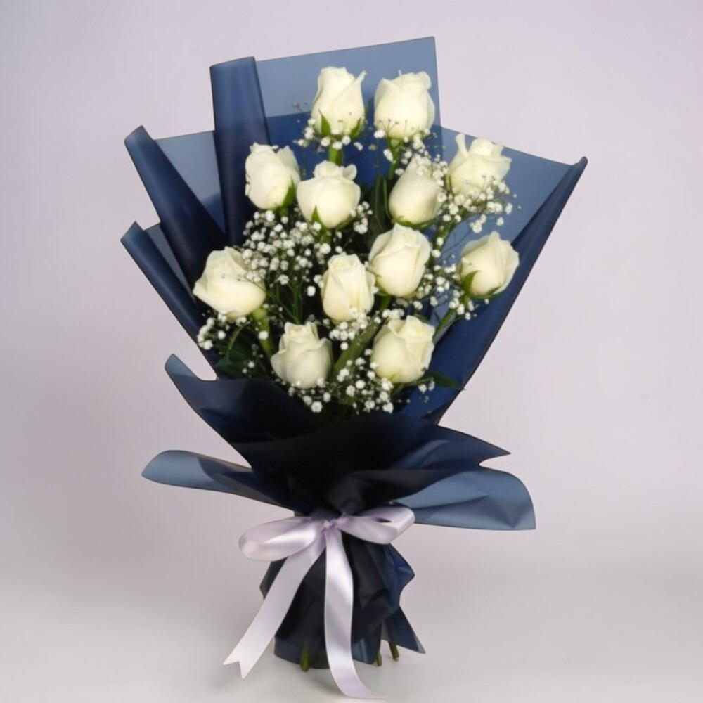 Bouquet of 12 white roses with fillers in a nice wrapping. Elegant bouquet of 12 white roses with delicate fillers, beautifully wrapped in premium paper for a timeless and graceful look. This white rose bouquet is perfect for weddings, anniversaries, and special occasions. Fresh, handpicked blooms offer purity, charm, and long-lasting beauty. Care tip: Trim stems at an angle, place in clean water, and keep in a cool area away from direct sunlight. Change water every 2 days to maintain freshness and extend vase life.