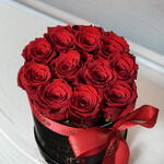 11 премиальных романтических красных роз в чёрной круглой коробке-1444