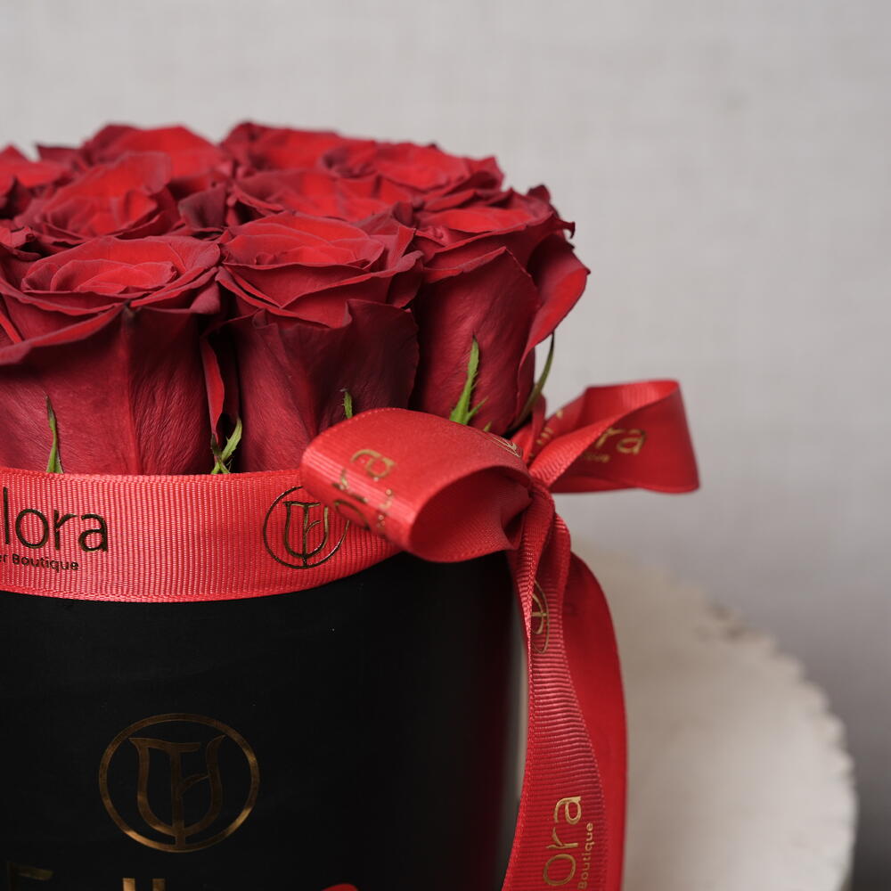 11 премиальных романтических красных роз в чёрной круглой коробке-1444