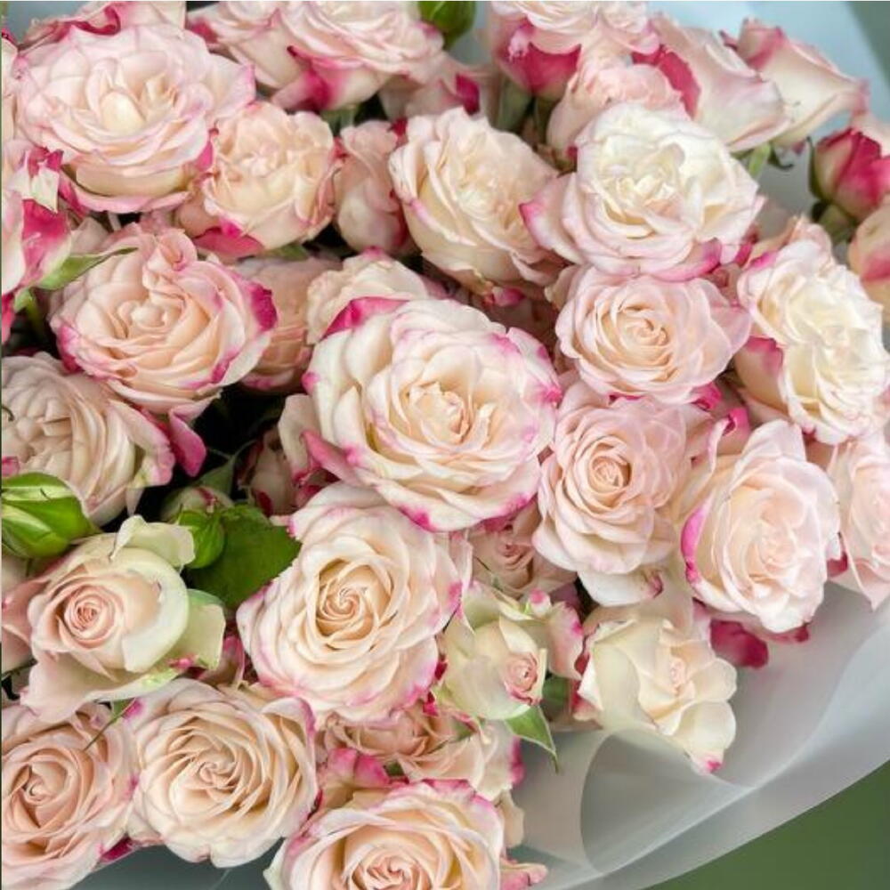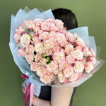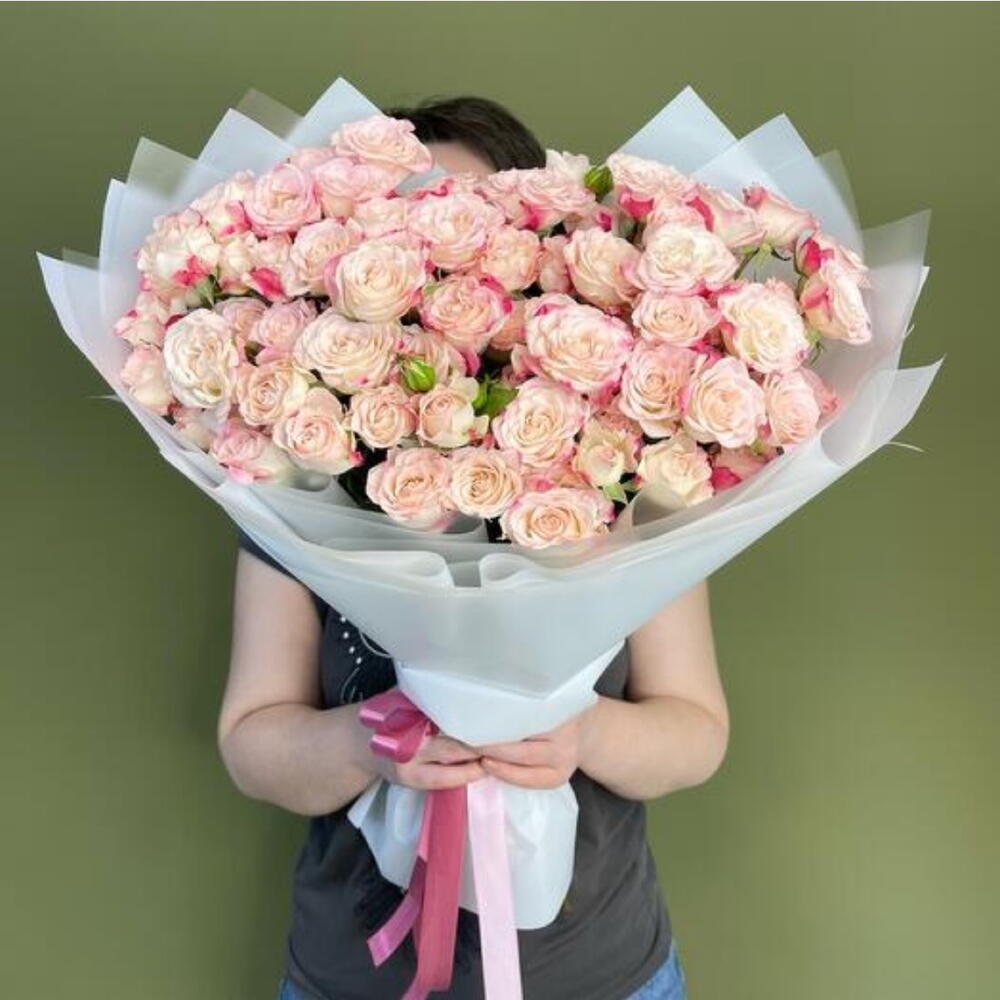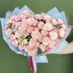 Букет из 15 розовых кустовых роз, на одном стебле кустовой розы может быть 3 или 4 цветка.