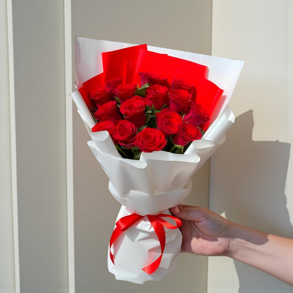 Описание - красивый букет из 15 красных роз в красно-белой упаковке, перевязанной красной лентой.