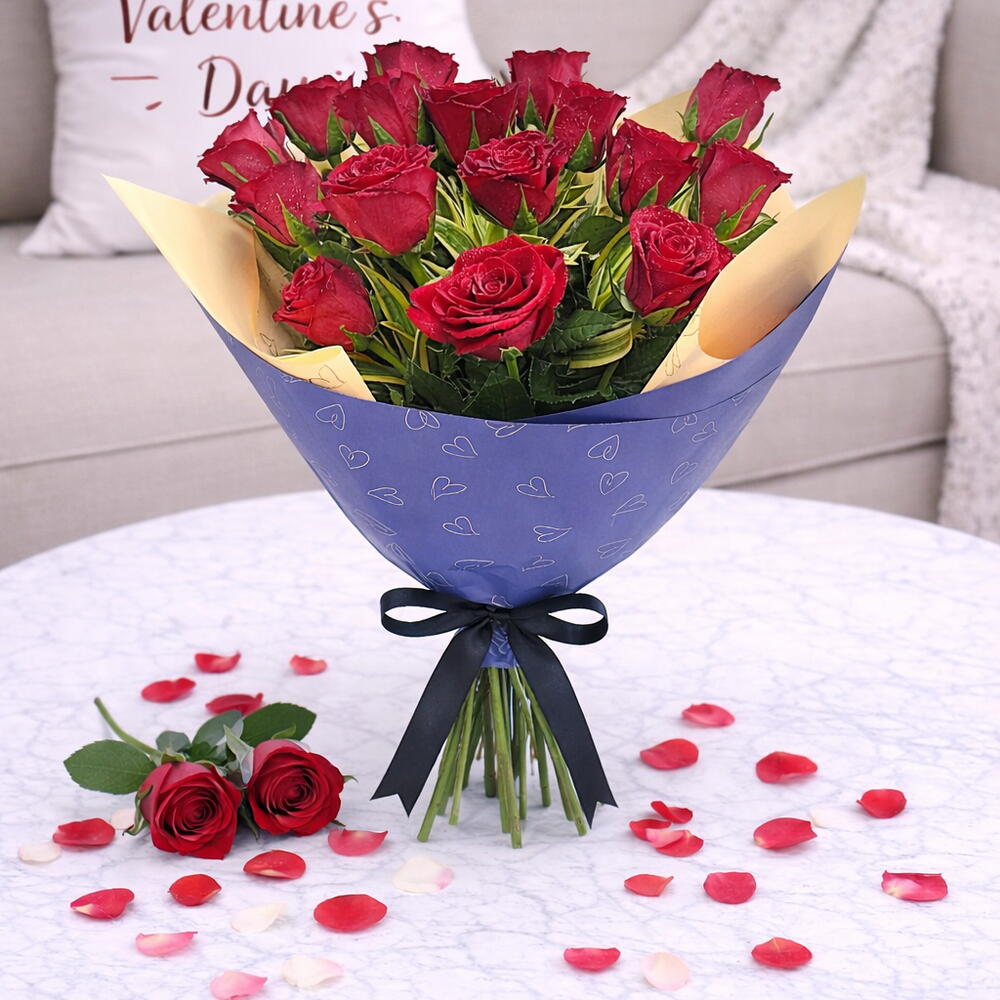 Описание - Прекрасный трогательный букет из 15 красных роз, оформленный с «Song of India», в персиково-голубой упаковке в форме сердца, завязанный черным бантом.