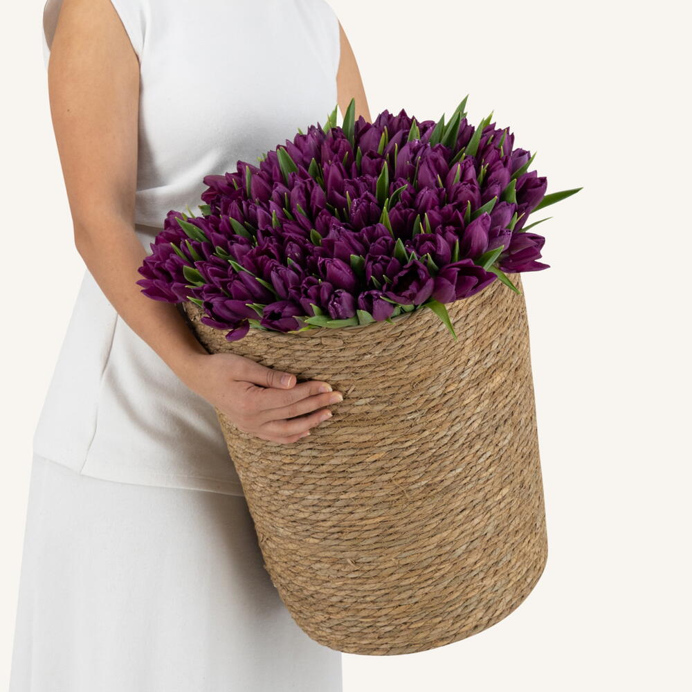 Корзина из 150 фиолетовых тюльпанов