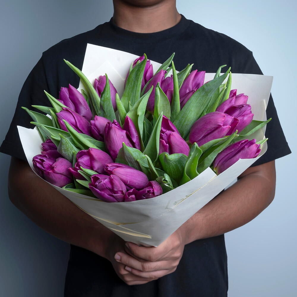 Букет из 19 стеблей фиолетовых тюльпанов, завернутый в натуральную бумагу и перевязанный лентой. Все цветы будут очень свежими и в стадии бутона или полураскрытыми. Цветы полностью раскроются позже, когда поставите их в воду. Меняйте воду каждый день и слегка подрезайте снизу стебли каждые два дня.