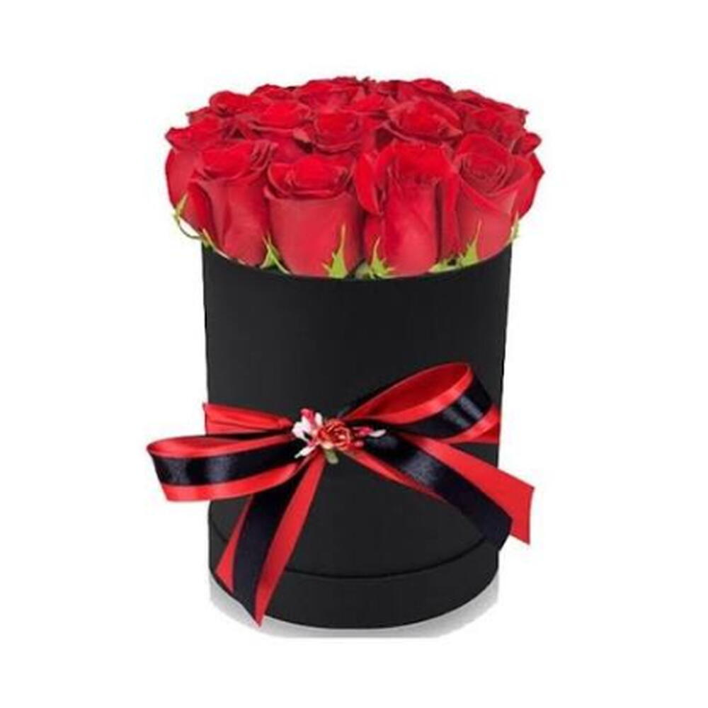 Red ribbon - 1 шт. круглая чёрная коробка - 1 шт. red roses - 20 шт.