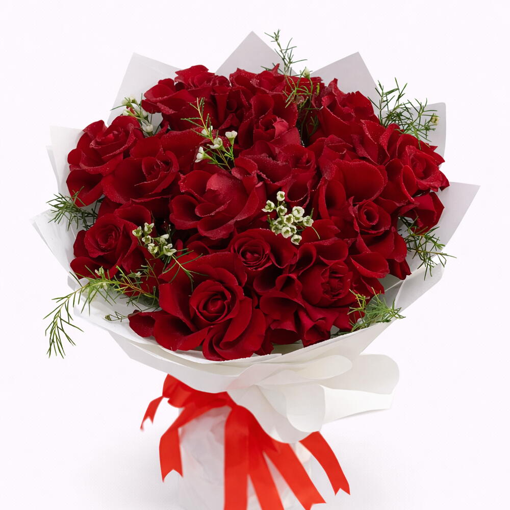 Прекрасный букет из 20 свежих красных роз, элегантно завернутый в белую бумагу, идеально подходит для подарка и выражения любви.