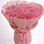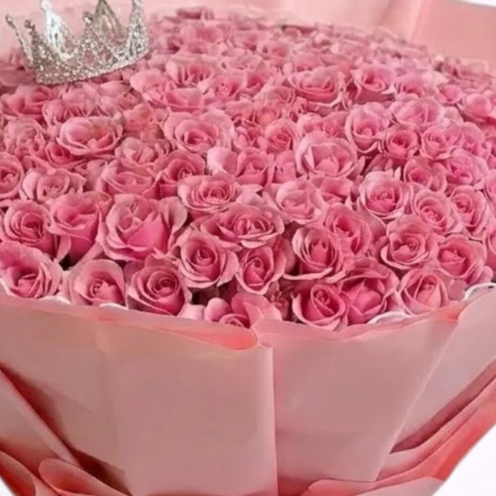 Большой, экстравагантный ручной букет, состоящий из многочисленных розовых роз, часто называемый розовым букетом роз. Букет оформлен в круглую, пышную форму и завернут в подходящую розовую бумагу с большим розовым бантом у основания.