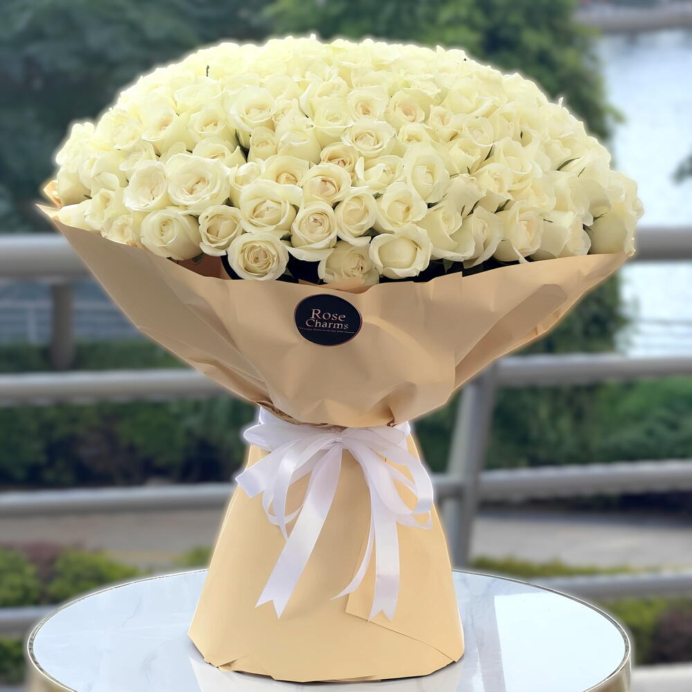 Роскошный букет с потрясающей композицией из 201 изящной белой розы — великолепное воплощение чистоты, элегантности и величия.