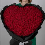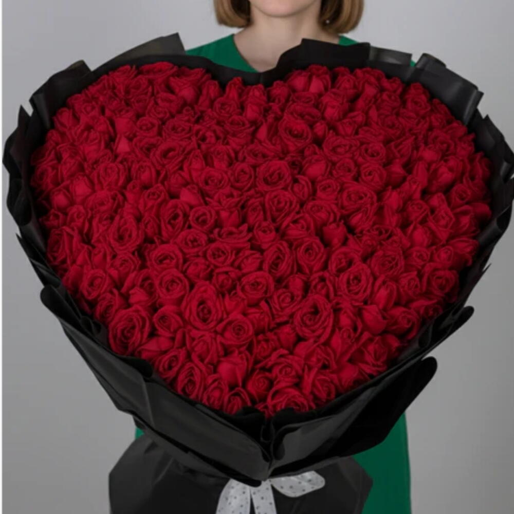 Большой букет, состоящий примерно из 201 премиальных красных роз. Оформление: Розы изящно уложены в впечатляющую форму сердца. Упаковка: Букет завернут в высококачественную чёрную бумагу или ткань, создавая драматичный контраст с красными розами. Поводы: Эта роскошная композиция предназначена для значимых событий, таких как годовщины, предложения руки и сердца, День святого Валентина или грандиозные романтические жесты.
