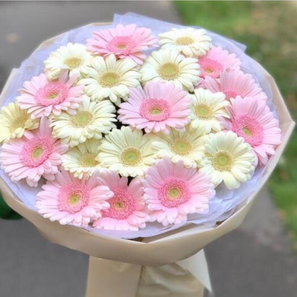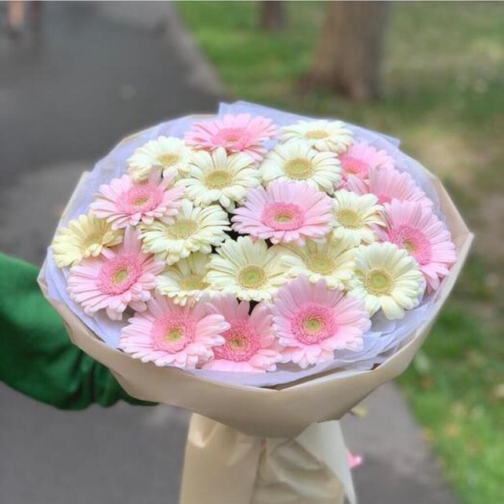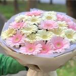 Ribbon - 1 шт. pink Gerbera - 10 шт. wrapping paper - 3 шт. желтая гербера - 11 шт.