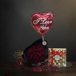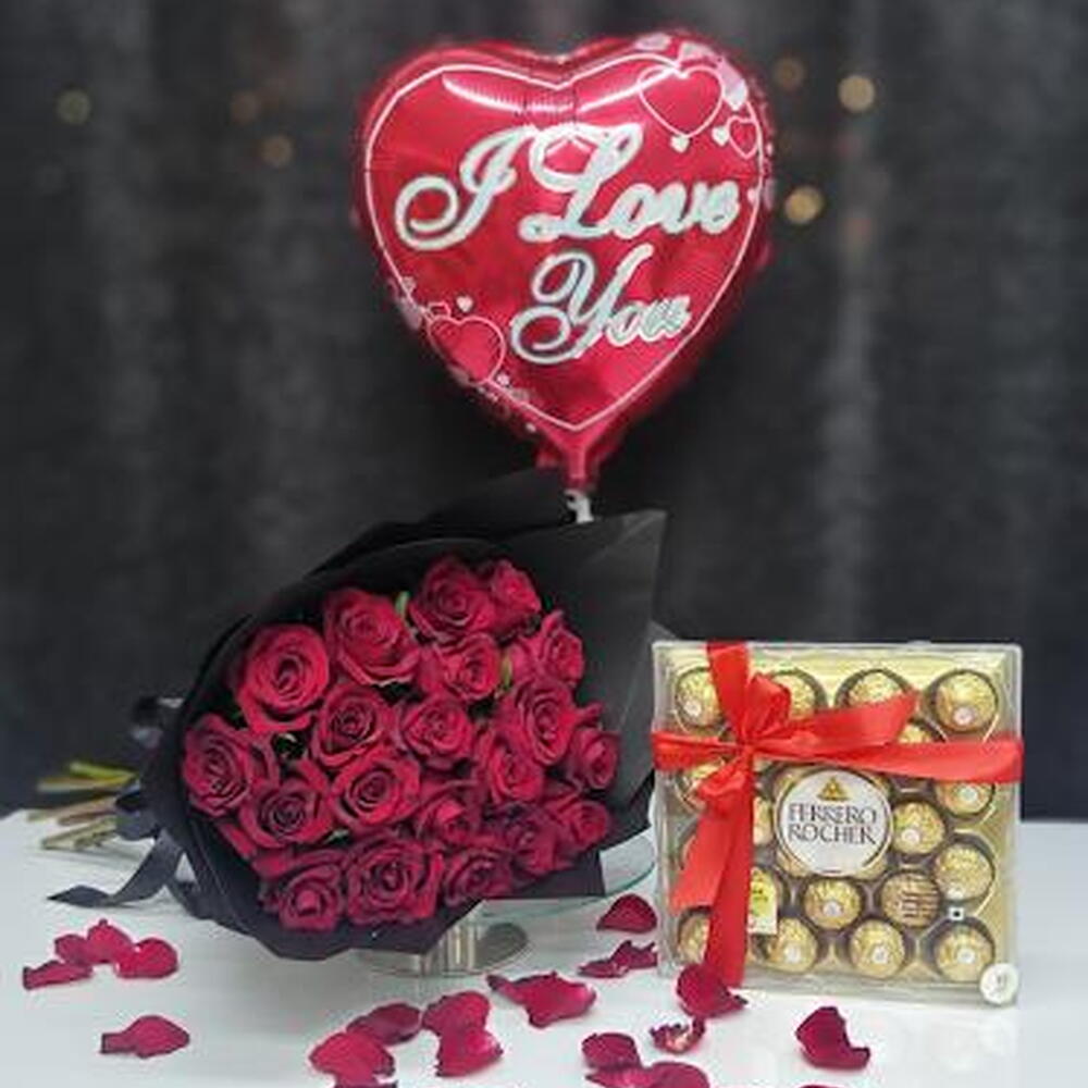 Red rose - 21 шт. Ferrero rocher - 24 шт. wrapping paper - 4 шт. воздушный шар из фольги - 1 шт.