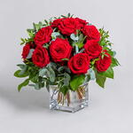 15 Красных Роз с Зеленью в Квадратной Стеклянной Вазе | Элегантная Цветочная Композиция ОАЭ