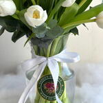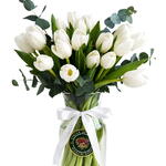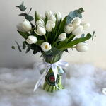 Неподвластная времени композиция из 21 белоснежного тюльпана, элегантно оформленная в вазе. Их нежная красота и спокойное очарование делают её идеальным центральным украшением или подарком для любого случая, символом элегантности, чистоты и умиротворения.