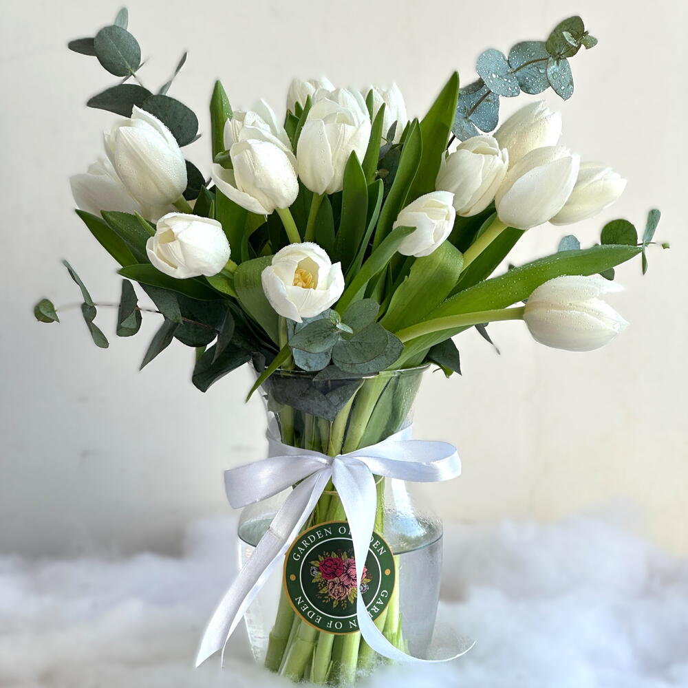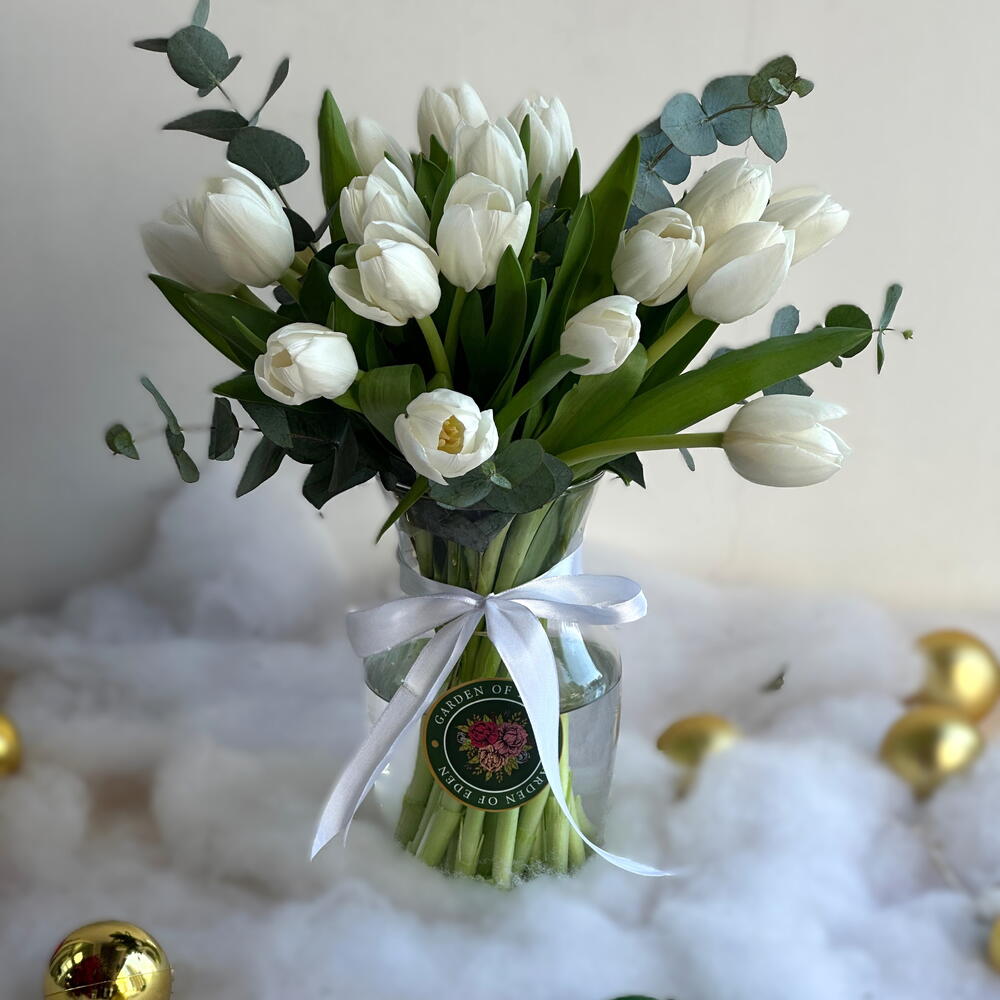 Неподвластная времени композиция из 21 белоснежного тюльпана, элегантно оформленная в вазе. Их нежная красота и спокойное очарование делают её идеальным центральным украшением или подарком для любого случая, символом элегантности, чистоты и умиротворения.