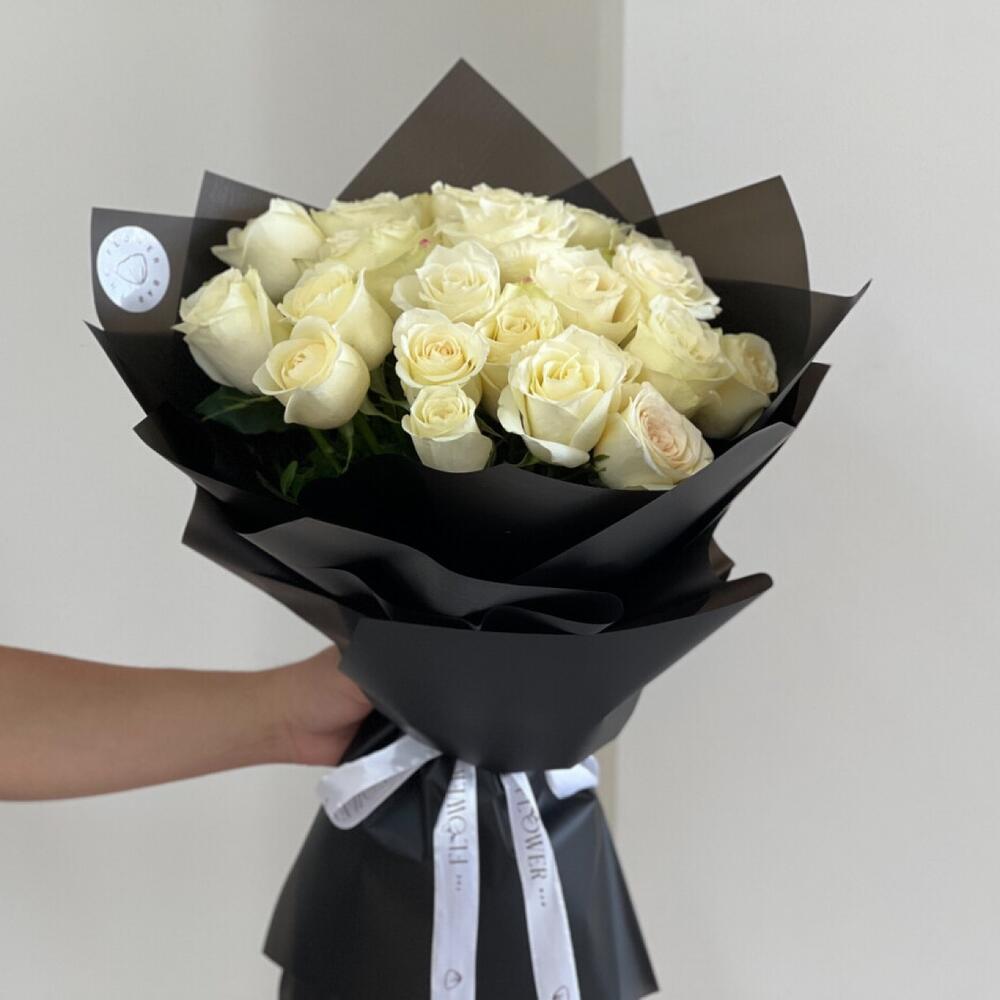 Яркое сочетание из 21 белой розы и черной упаковочной бумаги.