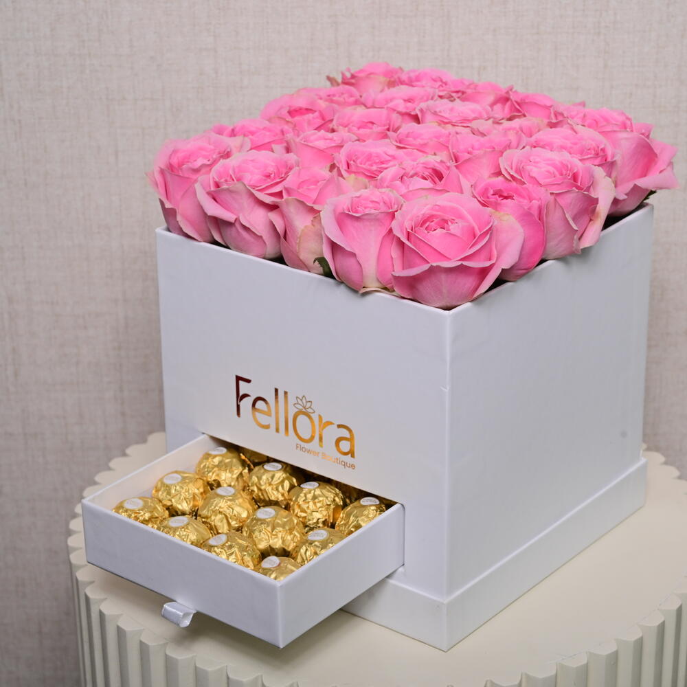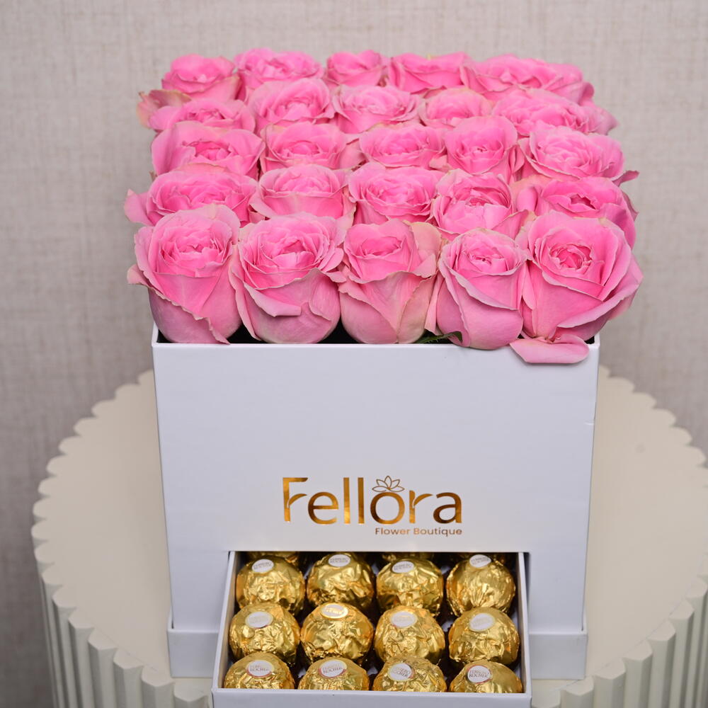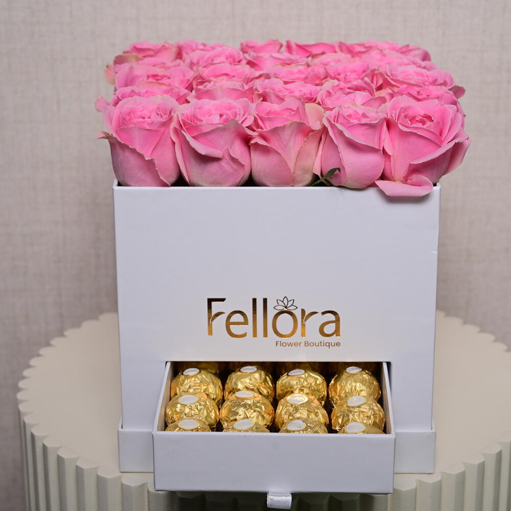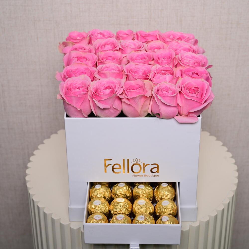 Прекрасное сочетание 25 премиальных розовых роз и 20 конфет Ferrero Rocher, оформленное в элегантной коробке, чтобы создать идеальный подарок. Это изысканное сочетание свежих цветов и изящных шоколадных конфет делает его идеальным выбором для любого особого случая — от годовщин до дней рождения или в качестве трогательного жеста для кого-то особенного. В Fellora Flower Boutique мы гордимся тем, что предлагаем высококачественные свежие цветы и роскошные шоколадные конфеты, обеспечивая приятные впечатления для каждого получателя.