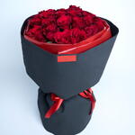 Букет из 25 стеблей красных роз, завернутых в высококачественную обёрточную бумагу и перевязанных красной лентой