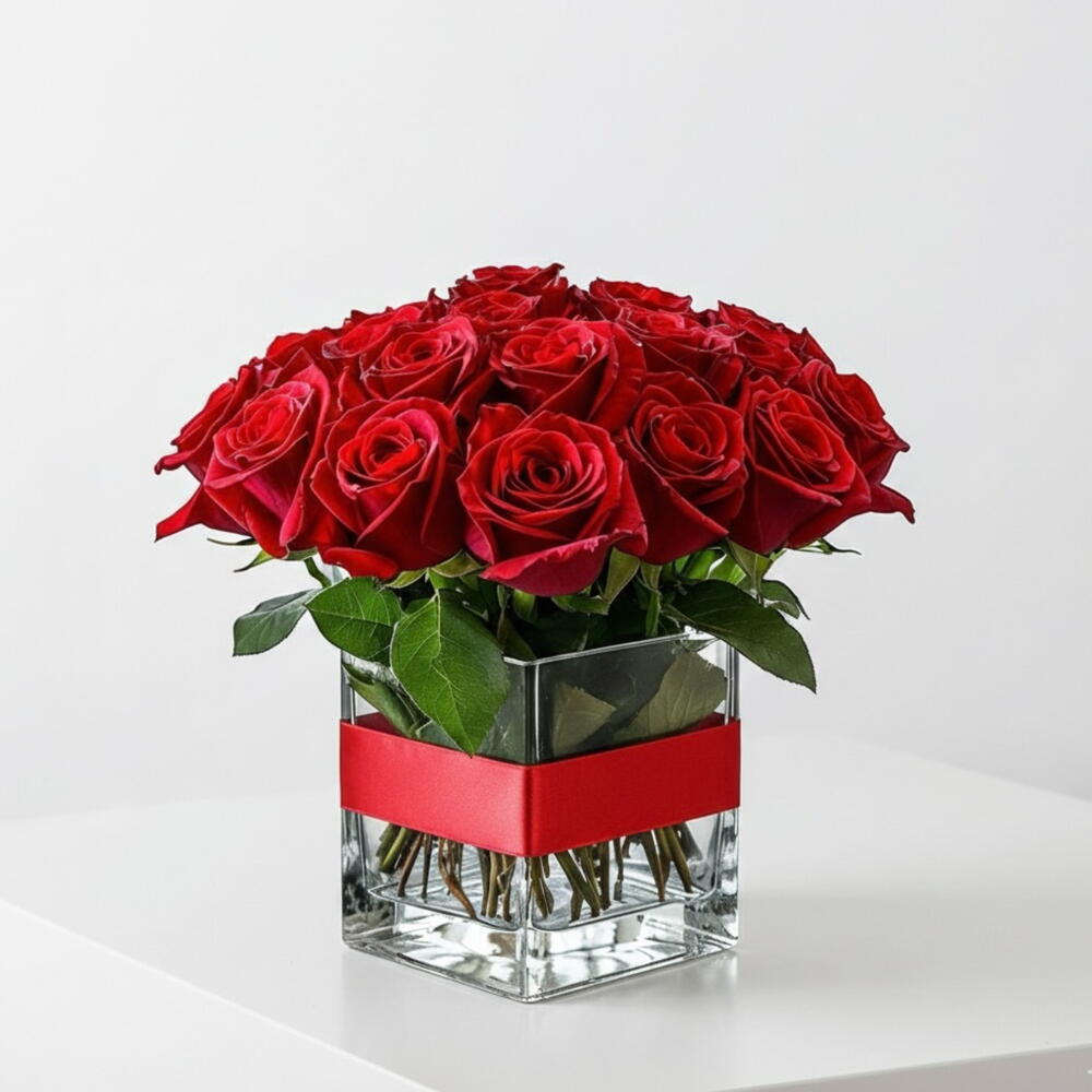 25 красных роз, уложенных в квадратную прозрачную вазу 12x12.