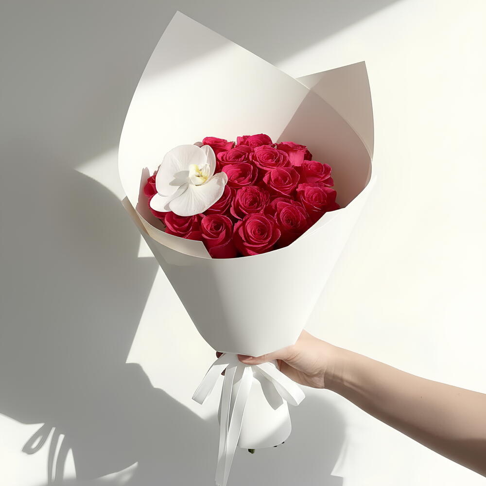 Уникальный и элегантный букет, сочетающий 25 красных роз с одной орхидеей, символизирующий любовь, красоту и изысканность. Идеально для годовщин, романтических проявлений или особых случаев.