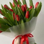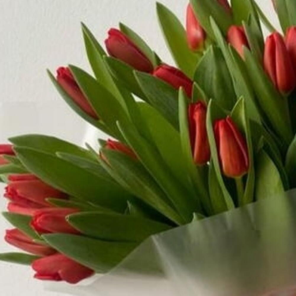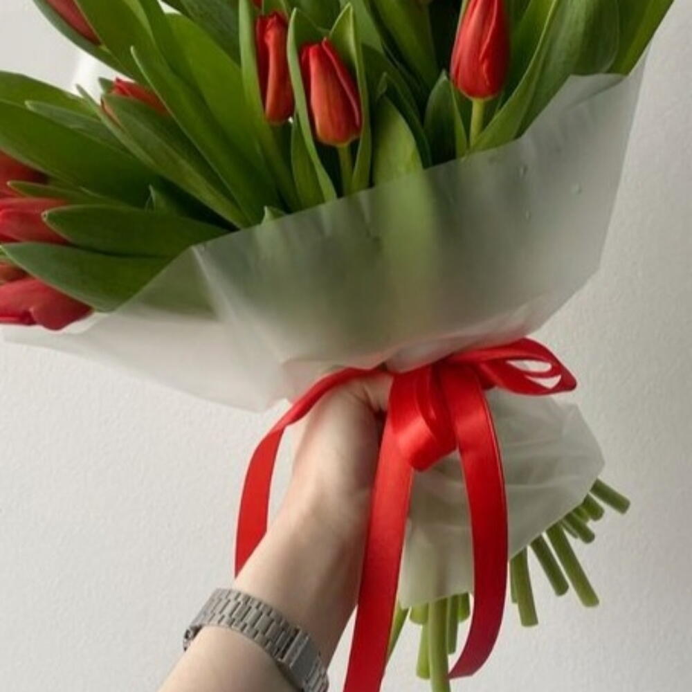 Bold and timeless, this bouquet of vibrant red tulips wrapped in translucent matte film is a stunning expression of admiration and passion. The lush green stems contrast beautifully with the deep red petals, creating an elegant and contemporary presentation. Perfect for corporate greetings, romantic gestures, or heartfelt thank-yous. To prolong freshness, place the tulips in cool, clean water upon arrival and trim the stems diagonally every 1–2 days. Keep the bouquet away from direct sunlight, heat sources, and drafts to ensure the tulips bloom gracefully.