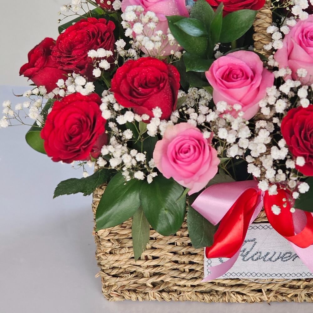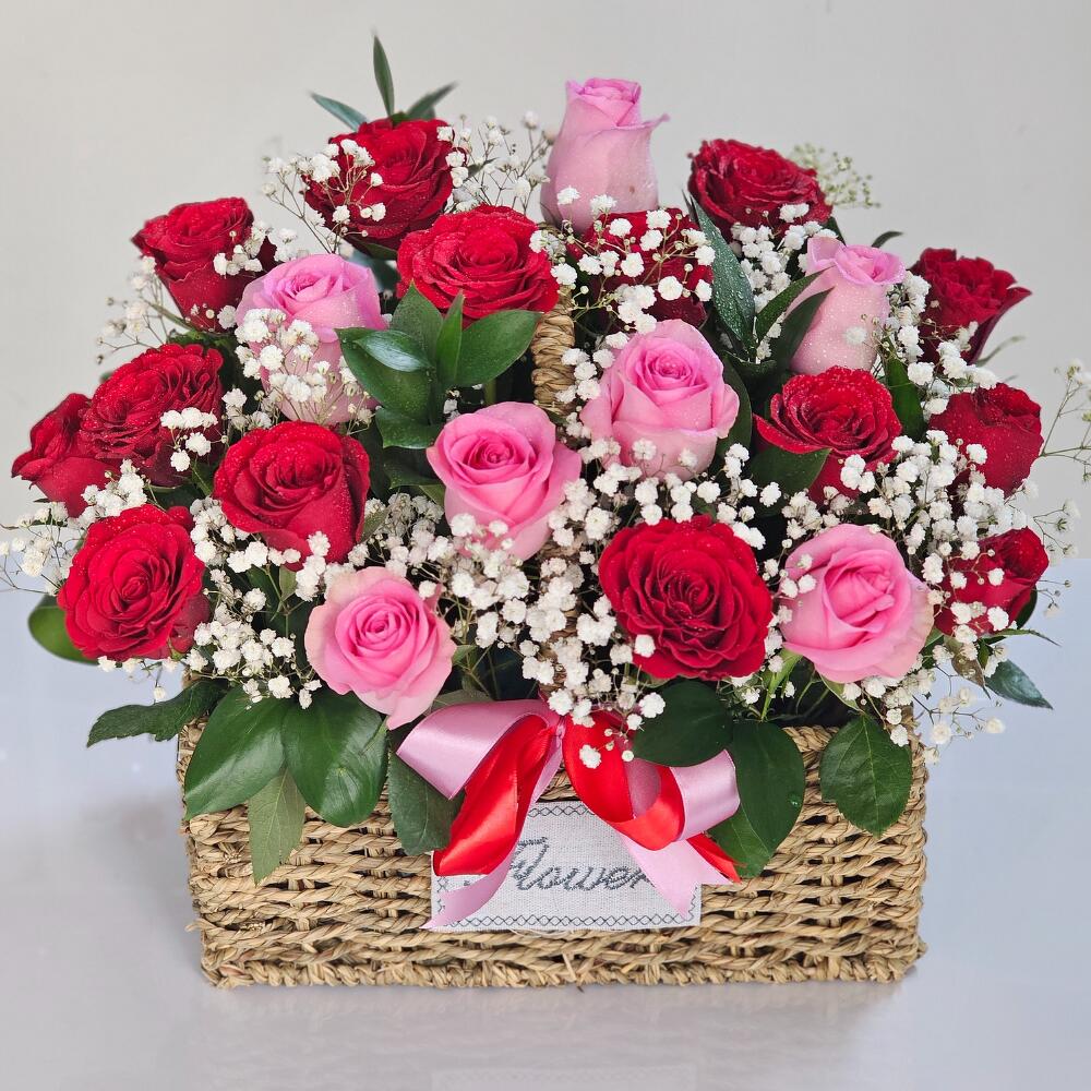 шоколад Ferrero - 200 гр. корзина с красными и розовыми розами - 24 шт.