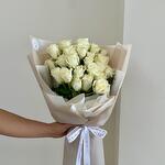 Букет из 25 белых роз в стильном сочетании белой и бежевой бумаги.