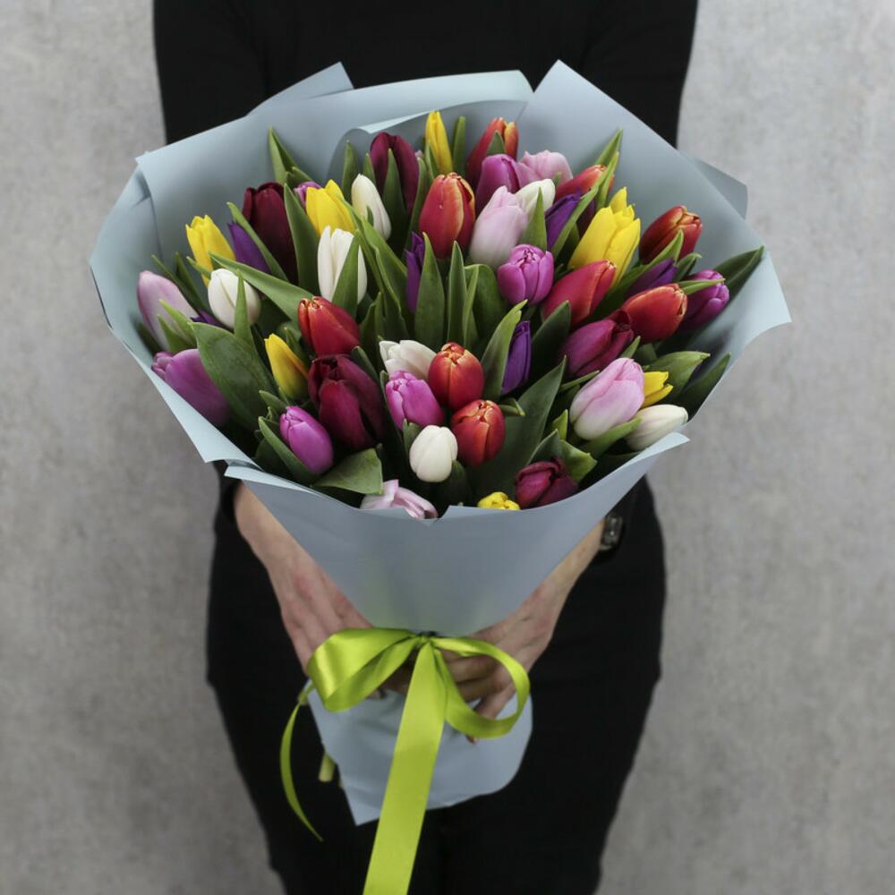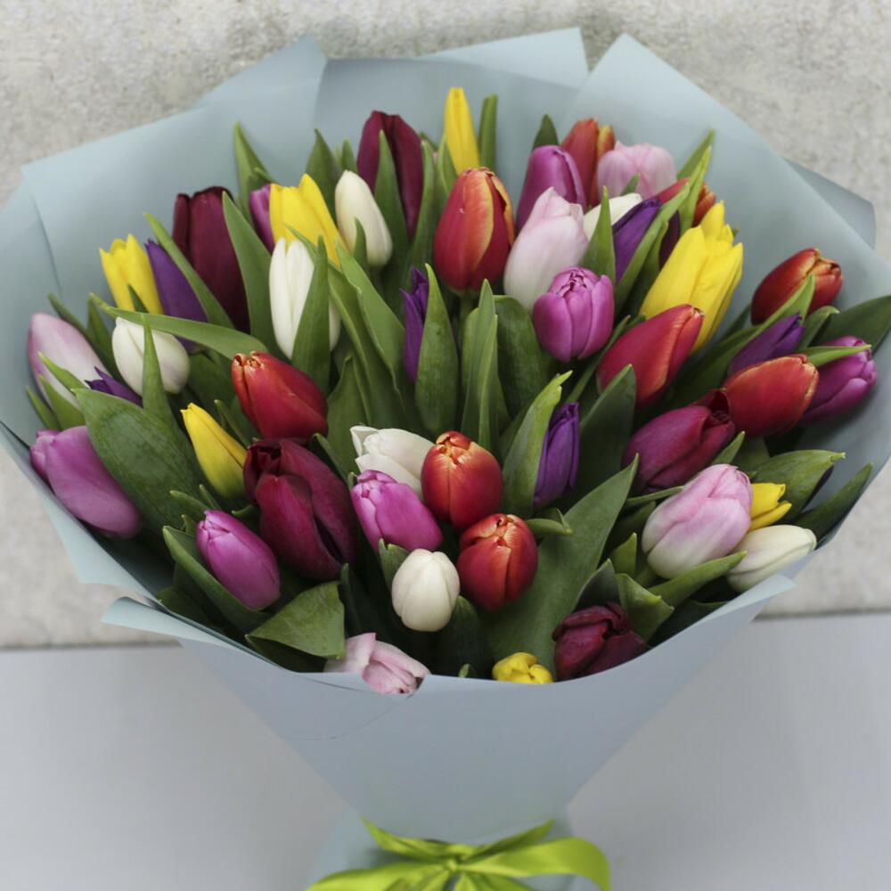 Ribbon - 1 шт. wrapping paper - 3 шт. mixed tulips - 51 шт.