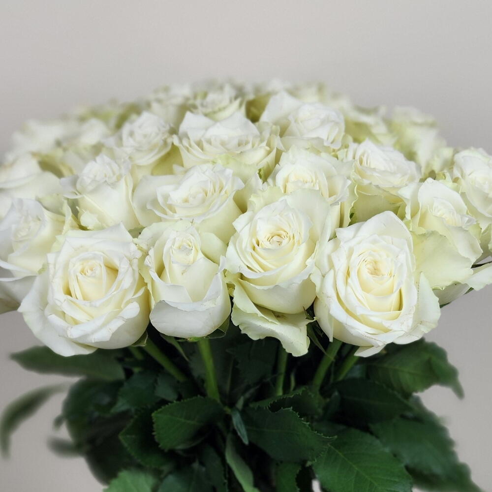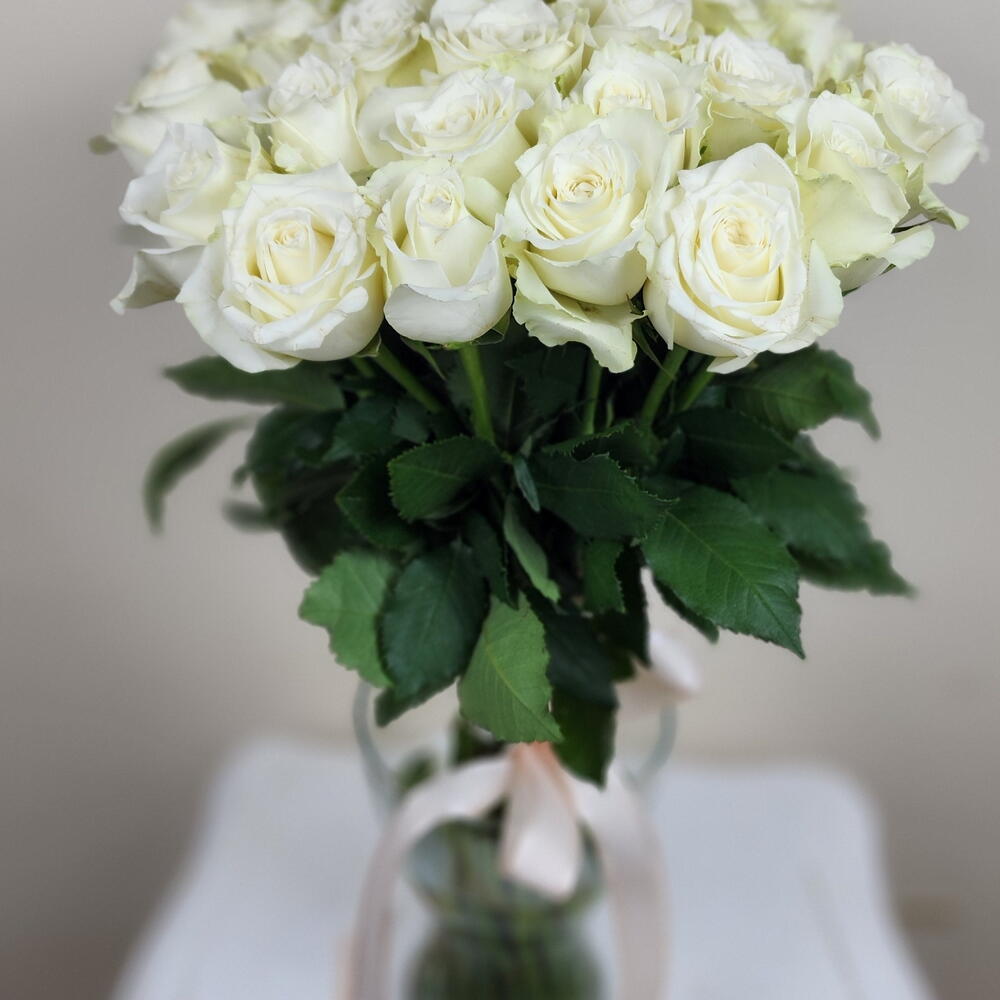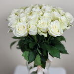 Elegant and effortlessly refined, this bouquet of white roses arranged in a glass vase is the perfect gesture of grace and purity. The soft cream-white blooms create a serene and timeless display, ideal for weddings, home decor, sympathy gifts, or simply to brighten someones day. Delivered beautifully in a vase, its ready to impress right out of the box—no arranging required. To enjoy their beauty longer, change the water every 2–3 days, trim the stems at an angle, and keep away from direct sunlight and heat.