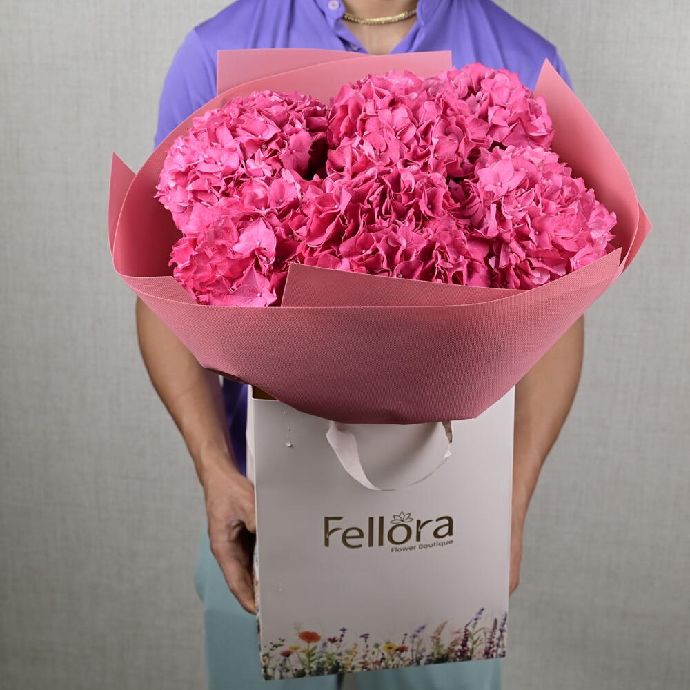 ribbon satin - 1 шт. paper bag - 1 шт. тёмно-розовая гортензия - 5 шт. украшение упаковки - 5 шт.
