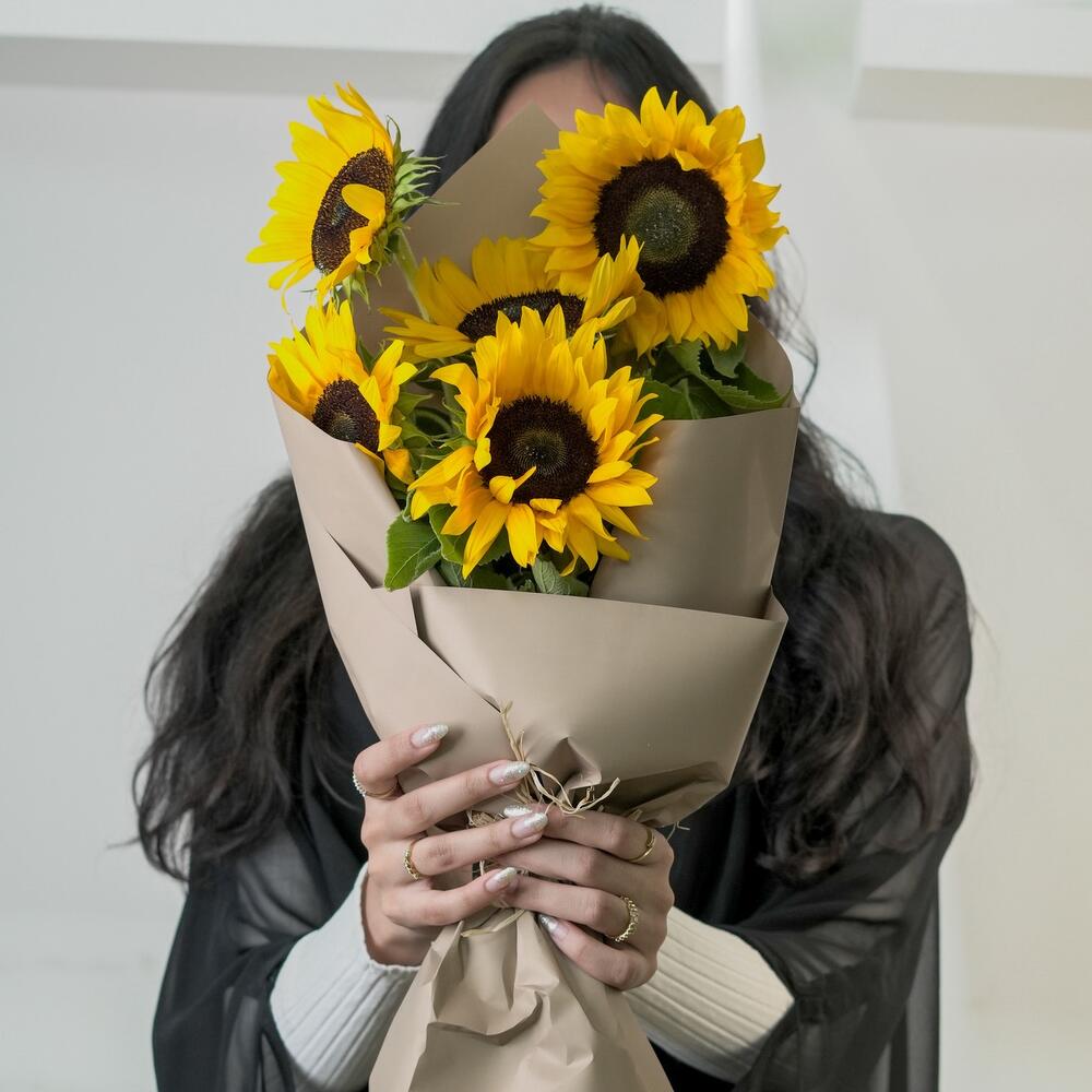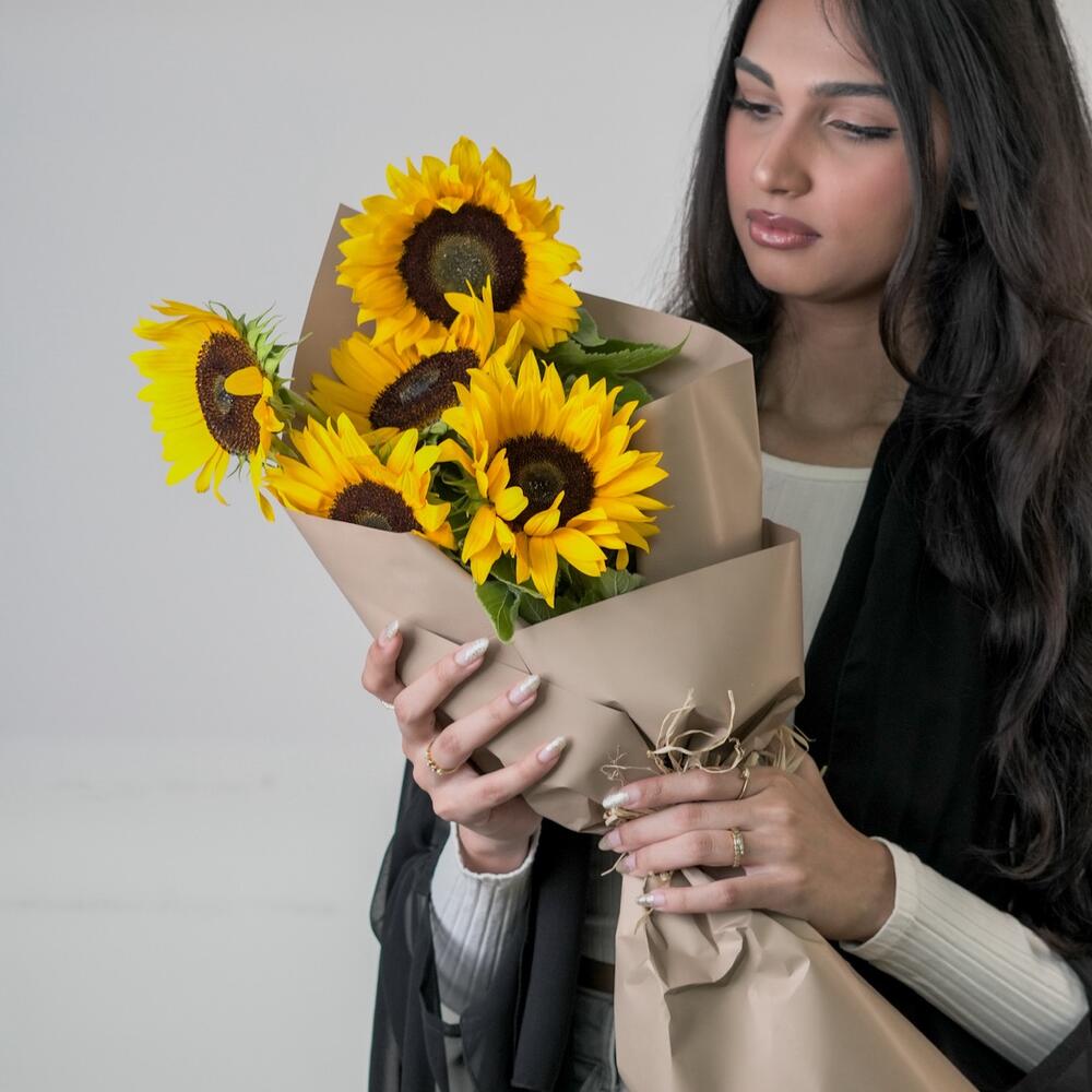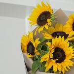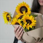 Ощутите тепло и радость с нашим моно-букетом из 5 потрясающих подсолнухов, тщательно отобранных вручную, чтобы дарить сияние при каждом взгляде. Умело завернутый в 3 листа стильной коричневой бумаги, этот букет воплощает сочетание солнечности и землистых нот. Идеальный выбор, чтобы осветить любую комнату или как сердечный подарок для ваших близких.
