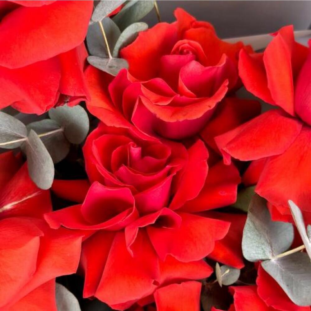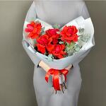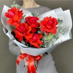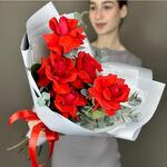букет из 5 премиальных распустившихся красных роз в широкой белой упаковке
